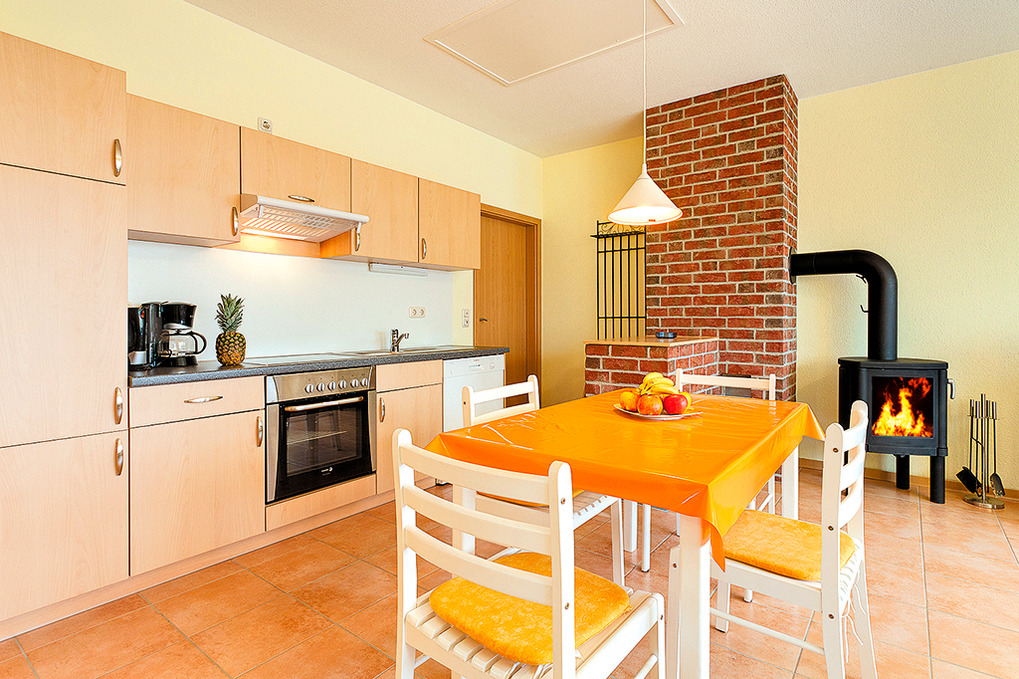 D 137.74 Ferienhaus 2-4 Pers.: 3-Zimmerhaushälfte, 56 qm Wohnfläche, Parterre. Wohn-/Essraum mit Sofasitzecke am Kaminofen, Sat-TV, DVD, Radio/CD, Esstisch, Einbauküche (Backofen, Spülmaschine). Doppelzimmer. 2-Bettzimmer. Großes Bad: Sauna, Du, Wb, WC, Waschmaschine.