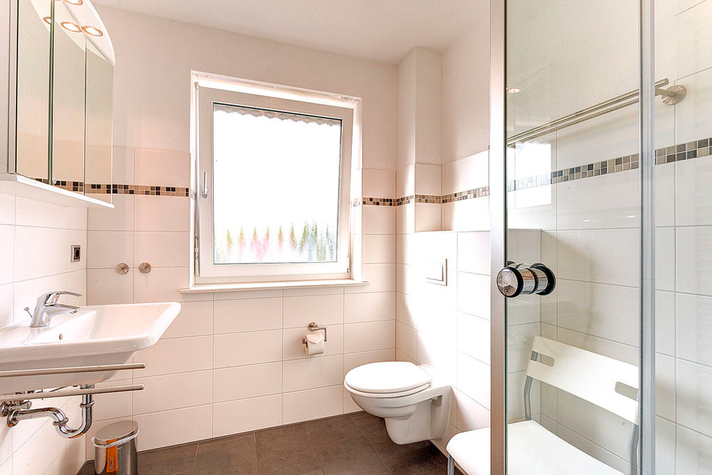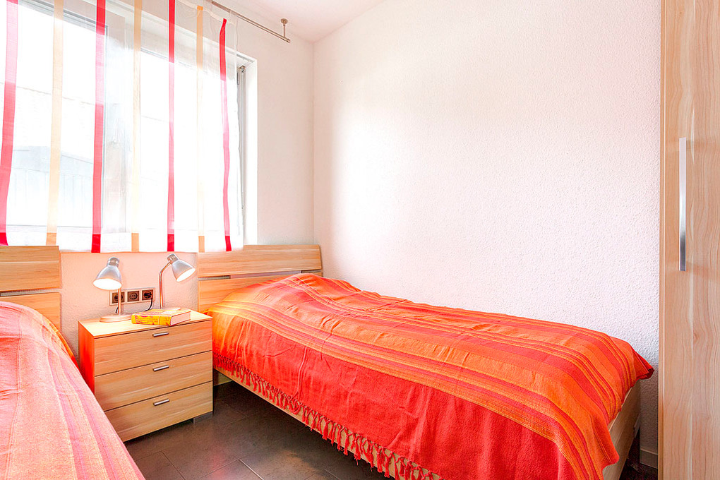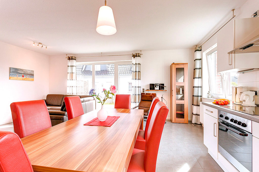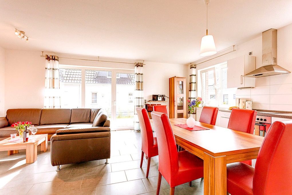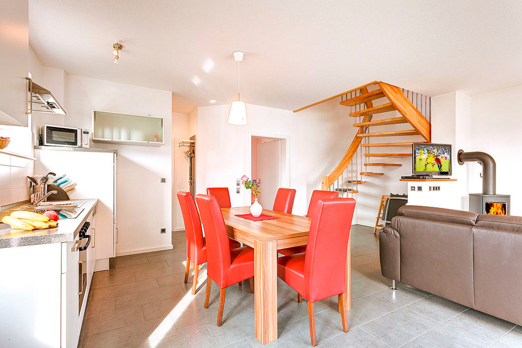 D 137.80 Ferienhaus 4-6 Pers.: 4-Zimmerhaushälfte mit 75 qm Wohnfläche über 2 Etagen. Parterre: Heller Wohn-/Essraum mit Sofasitzecke am Kaminofen, Sat-TV, Radio/CD, Esstisch, Einbauküche (Backofen, Mikrowelle, Spülmaschine). 2-Bettzimmer. Bad/WC. 1. Etage: Zwei Doppelzimmer. Bad/WC.