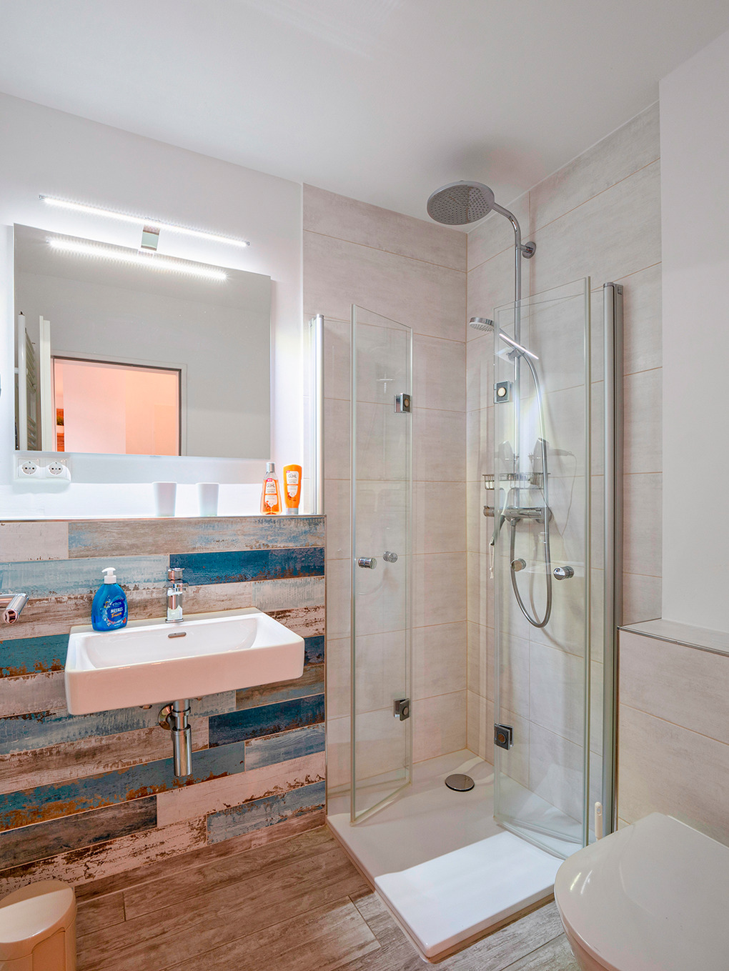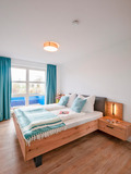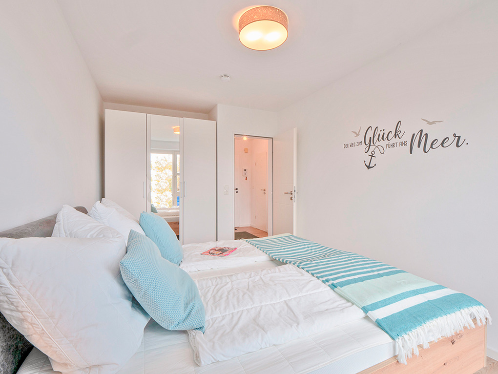 D 167.14 Wohnung 2-4 Pers.: 3-Zimmerwohnung mit 63 qm Wohnfläche über 2 Etagen. 1. Etage: Schöner Wohn-/Essraum mit Sitzgruppe, Smart-Sat-TV, Radio/CD, Esstisch, moderner Einbauküche (Backofen, Spülmaschine), Balkon. Doppelzimmer mit Balkon. Bad/WC. Vom Wohnraum steile Raumspartreppe ins ausgebaute Dachgeschoss (keine Kindersicherung, Schrägen): Offener Wohn-/Schlafraum mit gemütlicher Sitzecke, Sat-TV, zwei stapelbaren Einzelbetten. Separates WC, Wb.
