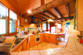 Parterre: Sehr großer Wohnraum (80 qm!), ausgebaut bis zum Dachgiebel mit zentralem Kamin, Sofa-Sitzecke, TV, Video, gr. Esstisch, thekenartig abgetrenntem Küchenbereich (Backofen, Grill, Spülmaschine). Schönes großes 5-Bettzimmer mit franz. Bett, Etagenbett, Einzelbett, Balkon. Bad: Du, Wb. Separates WC.