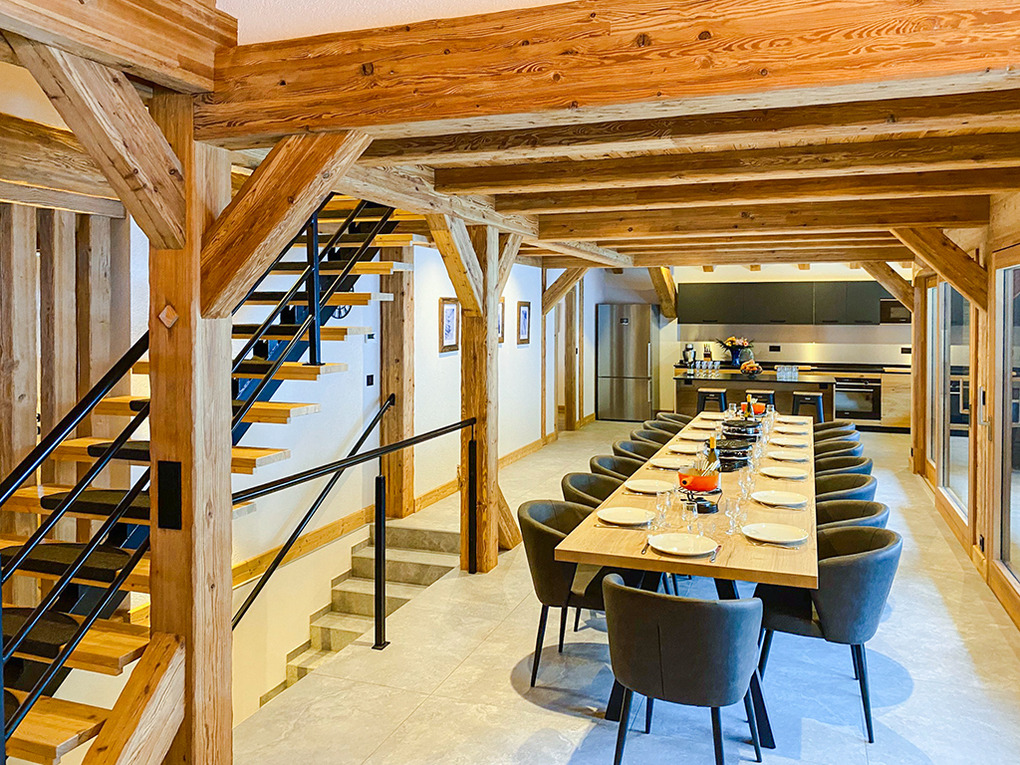 Haus: Regionaltypisches Bauernhaus, aufwendig renoviert und umgebaut zum komfortablen Ferienhaus mit Sauna und Whirlpool. 10-Zimmer-Chalet mit 340 qm Wohnfläche über 3 Etagen. Sieben Schlafräume, alle mit eigenem Bad (Du, Wb, WC). Rustikal-gemütliches Chalet-Flair durch Holzvertäfelung in allen Räumen. Sehr großes Platzangebot, moderne Komfortausstattung. Internetzugang über W-Lan. Billard, Kicker, Tischtennis-Platte. Waschmaschine, Trockner. Skiraum mit Schuhtrocknern. Zentral-/Fußbodenheizung. Großer überdachter Balkon mit Sitzmöbeln, Grill. Außen-Whirlpool. 5 Pkw-Stellplätze vorhanden. Ladestation für E-Autos am Haus (Gebühr).