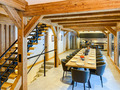 1. Etage: Sehr großzügiger Wohnraum mit schöner Panoramafensterfront, Billard-Tisch, Kicker, gemütlicher Sitzecke am Kaminofen, Smart-TV, großem Esstisch, moderner Einbauküche (Backofen, Mikrowelle, Spülmaschine), Balkon. Zwei Doppelzimmer mit Bad (Du, Wb, WC). Separates WC.