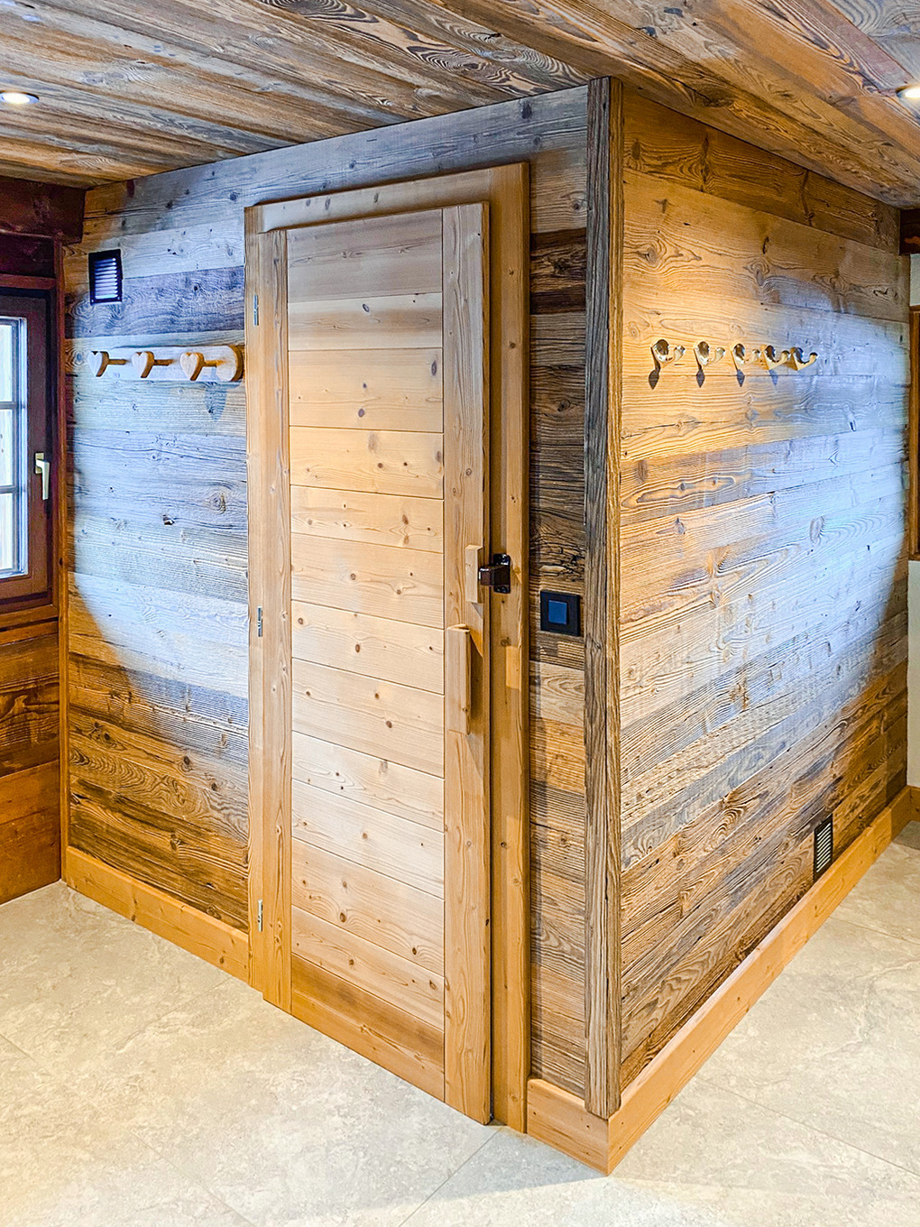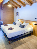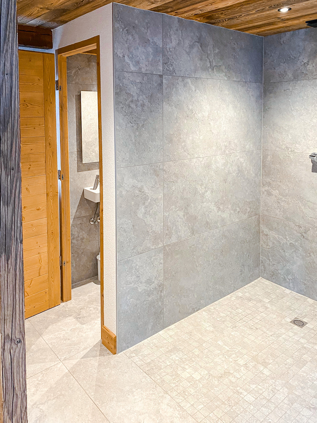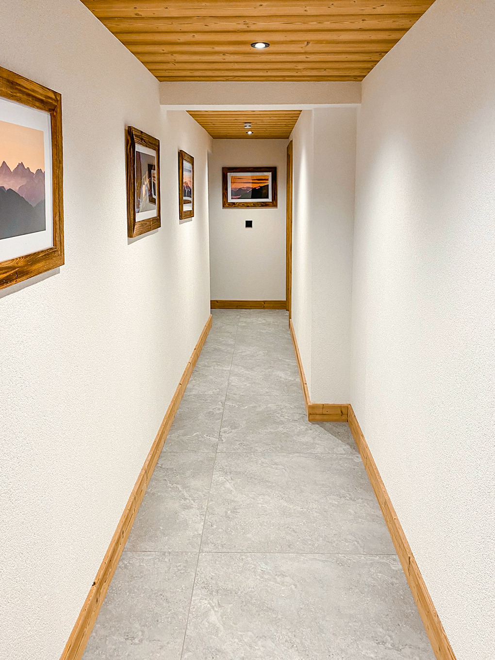 Parterre: Skiraum mit Schuhtrocknern. Zwei Doppelzimmer mit Bad (Du, Wb, WC). 3-Bettzimmer mit 3 Einzelbetten, Bad (Du, Wb, WC). Kleiner Wellnessbereich mit Sauna, Dusche, WC. Zugang zum Whirlpool.