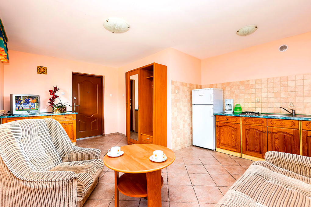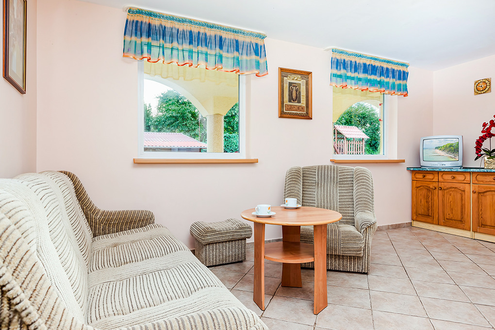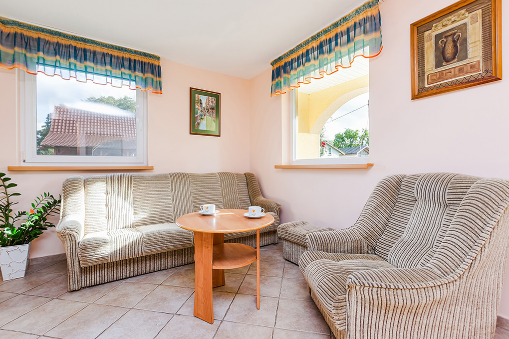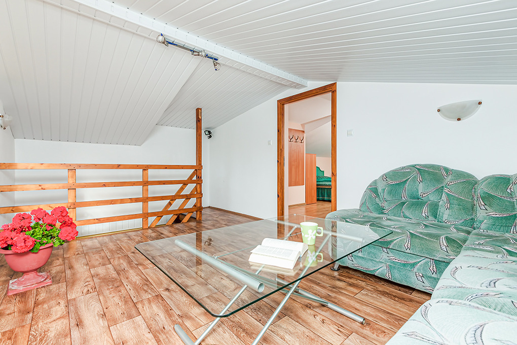 PL 10.5 Ferienhaus 2-6 Pers.: 2-Zimmerhaus mit ca. 50 qm Wohnfläche über 2 Etagen. Parterre: Geräumiger Wohn-/Essraum mit 2 Sesseln, Schlafsofa (2 Pers.), Sat-TV, Esstisch, Küchenzeile. Bad/WC. Dachgeschoss mit Schrägen: Großes 4-Bettzimmer mit Balkon, offen zur Treppe.