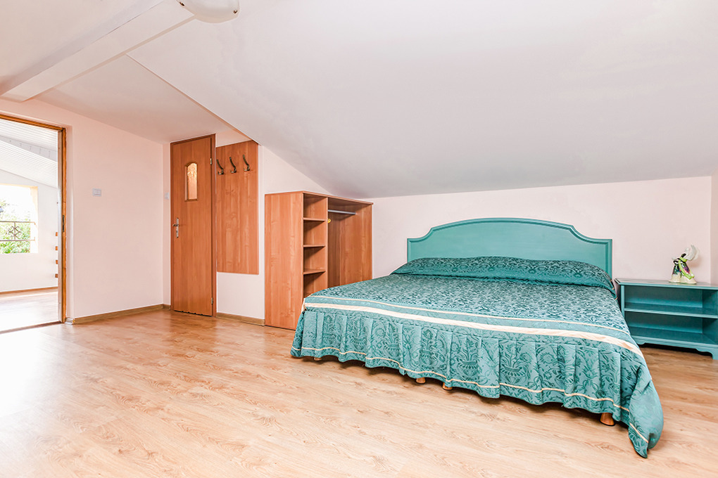 PL 10.6 Ferienhaus 2-6 Pers.: 2-Zimmerhaus mit ca. 50 qm Wohnfläche über 2 Etagen. Parterre: Wohn-/Essraum mit Ausziehsofa (2 Pers.), Sat-TV, Küchenzeile. Bad/WC. Überdachte Außentreppe ins Dachgeschoss mit Schrägen: Großes 4-Bettzimmer mit Doppelbett, 2 Einzelbetten. Separates WC. Loggia mit Balkonmöbeln.