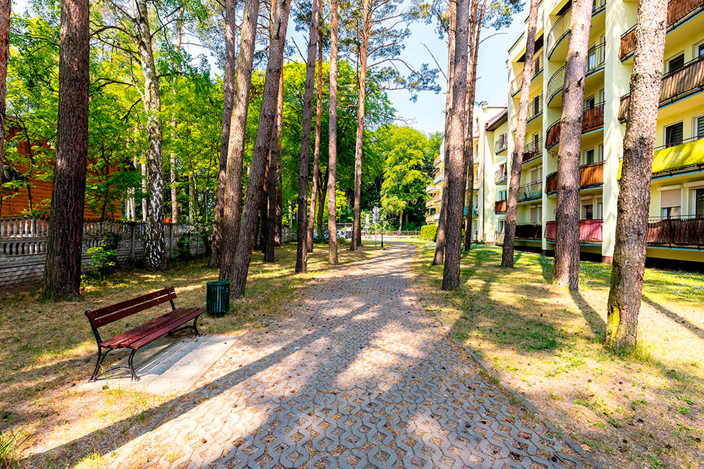 Ort: Ostseebad Miedzyzdroje (Misdroy). Erstklassige, ruhige Lage am Ortsrand. Ostseestrand 120 m. Einkaufen, Restaurant 150 m. Ortsmitte mit Geschäften 800 m. Seebrücke 1,3 km. Hotelhallenbad mit Sauna, Wellnessbereich 120 m.