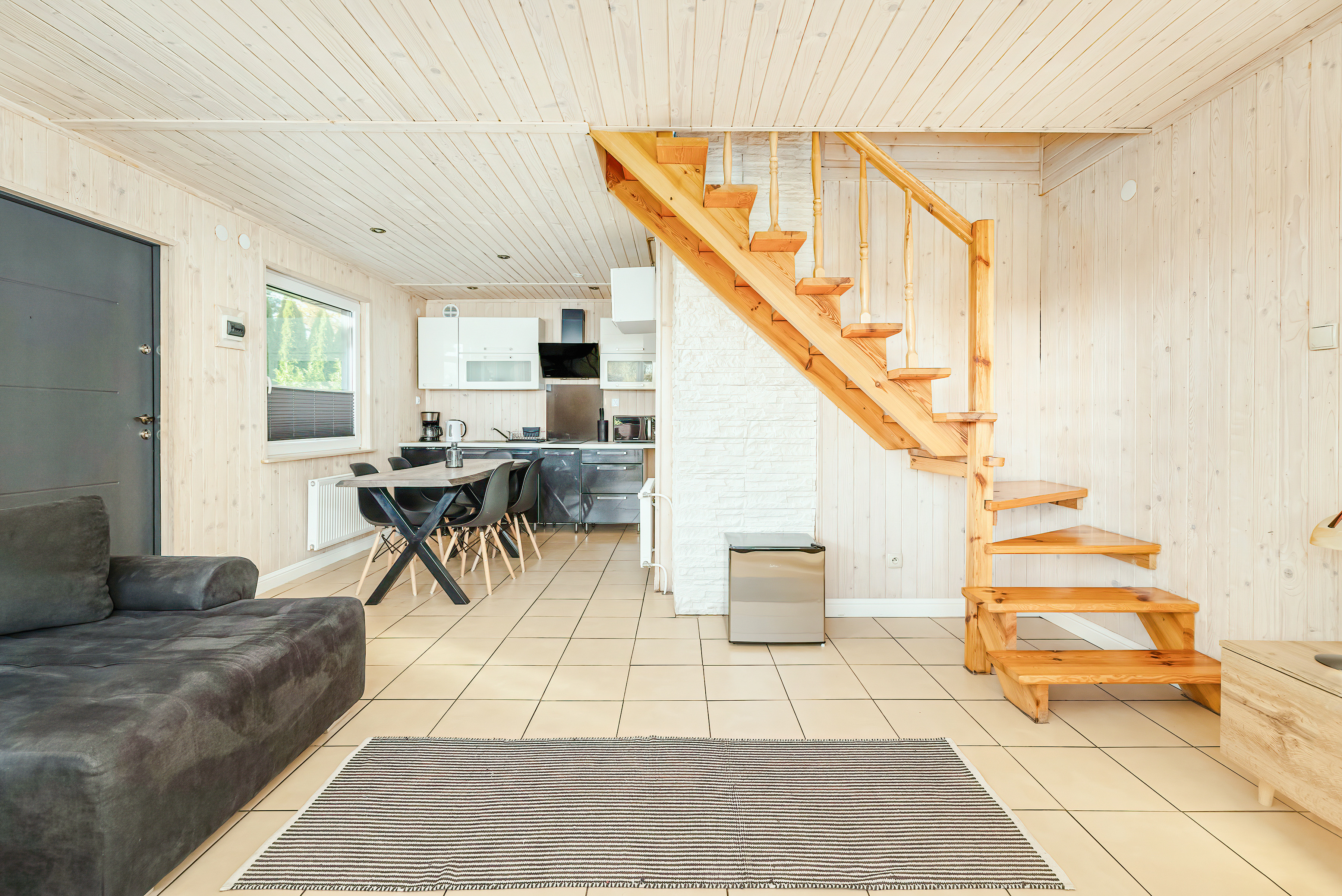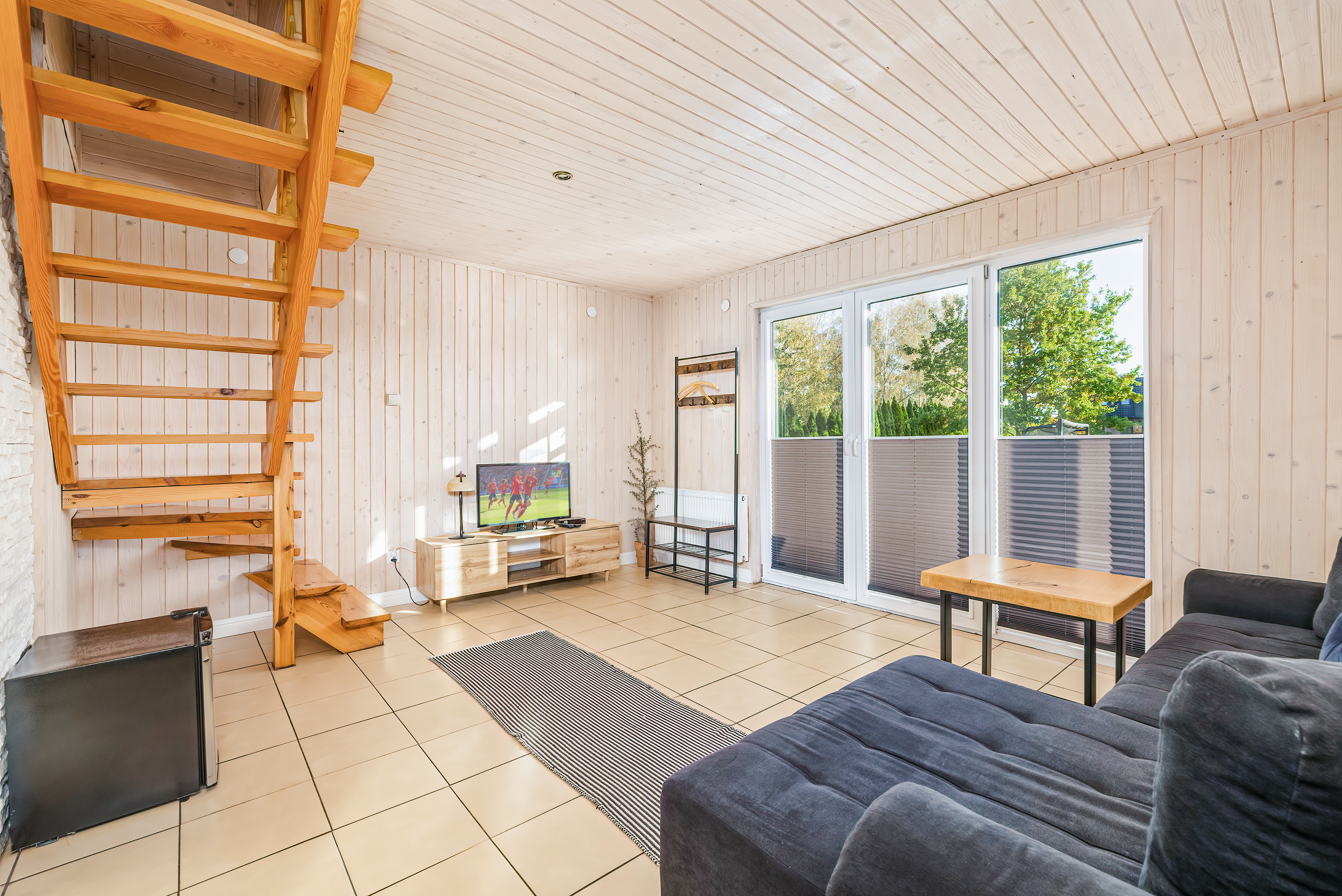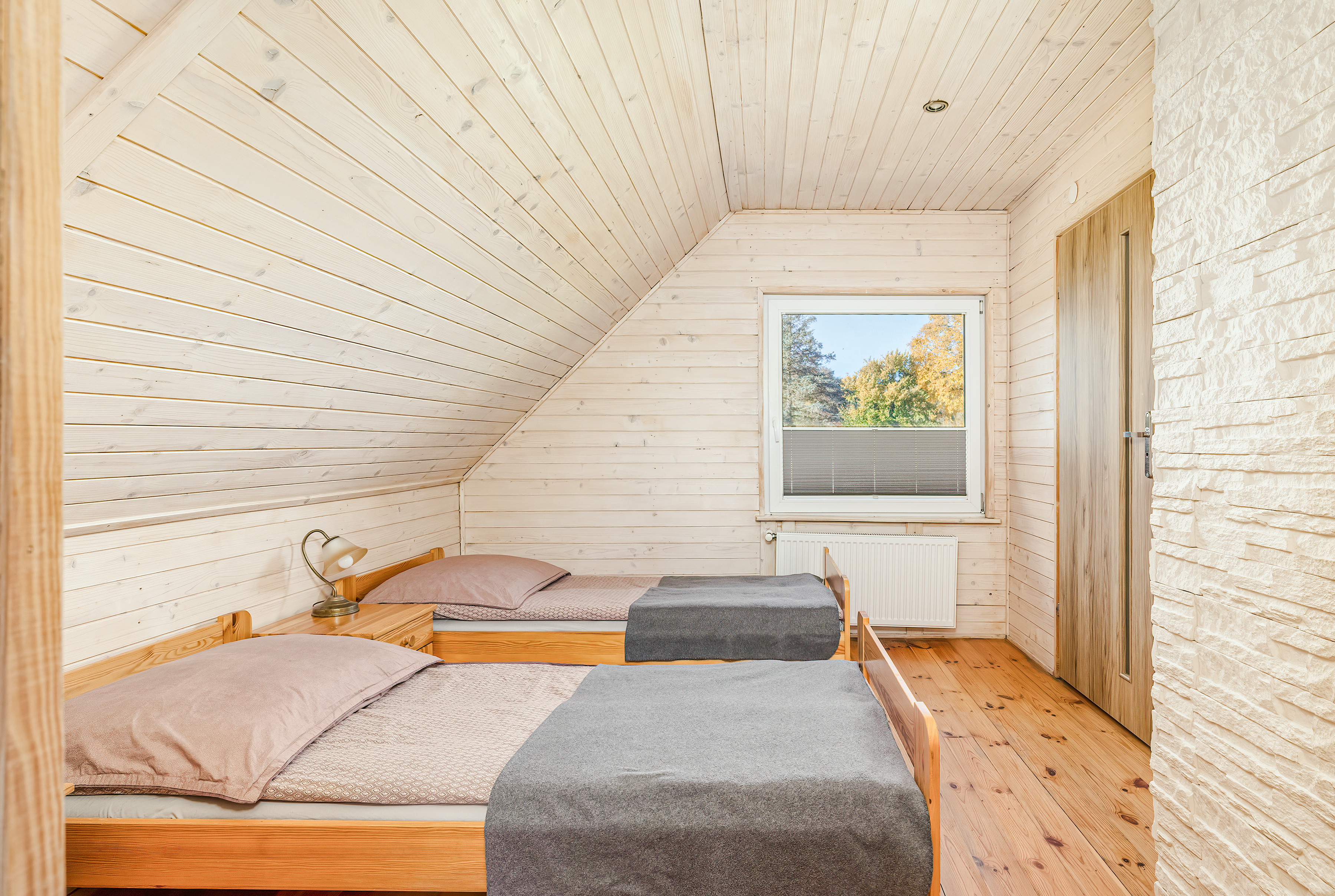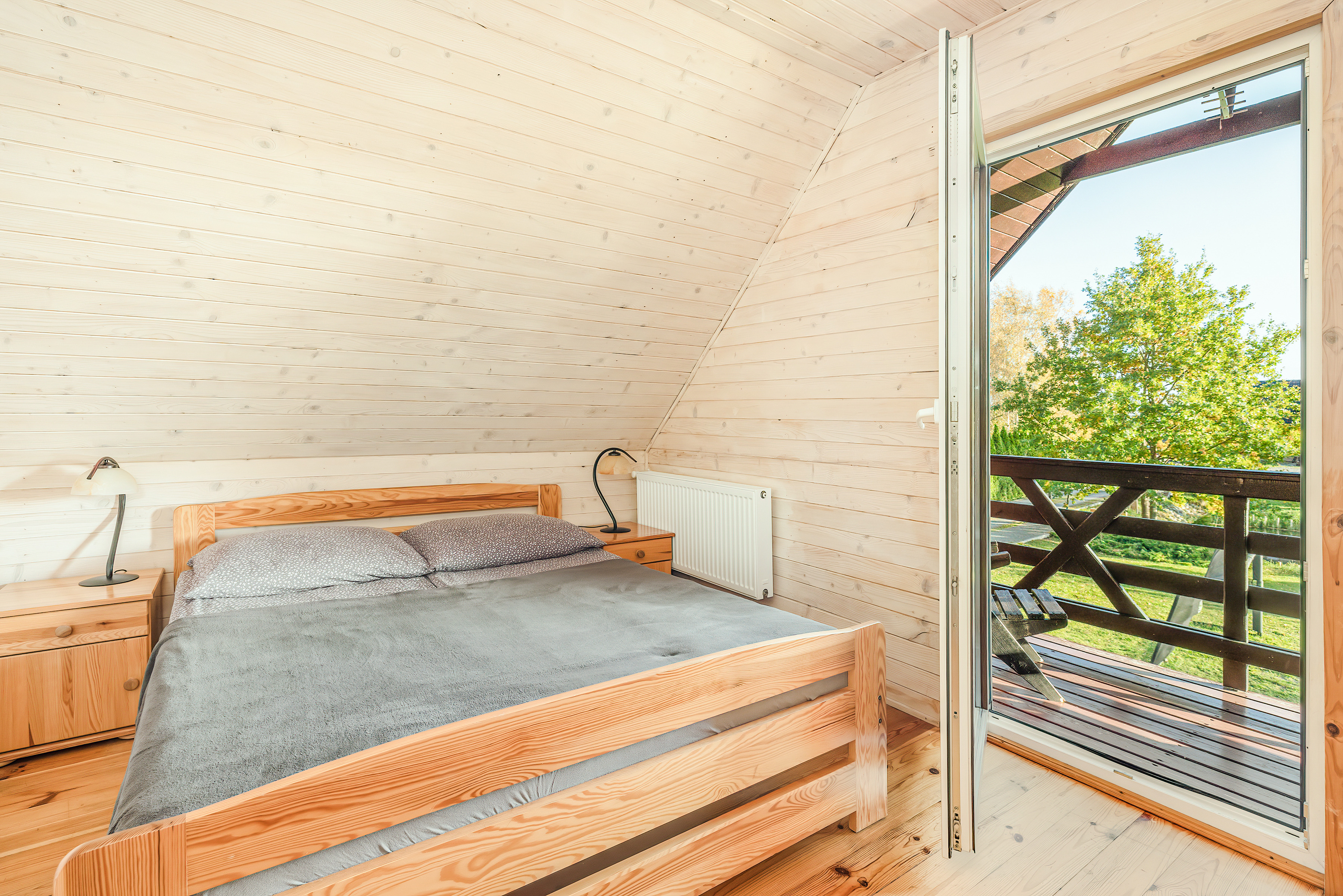 PL 11.80 Ferienhaus 2-6 Pers.: Schönes 3-Zimmerhaus mit 54 qm Wohnfläche über 2 Etagen. Parterre: Wohn-/Essraum mit Sofa (Ausziehcouch 2 Pers.), Sat-TV (dt. Programme), Internet (WLAN) Esstisch, Küchenzeile (2 E-Platten). Bad/WC. Dachgeschoss: Doppelzimmer mit Balkon. 2-Bettzimmer, offen zur Treppe. Separates WC. Große Terrasse mit Sitzmöbeln und idyllischem Blick auf den Gartenteich.