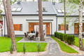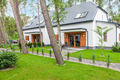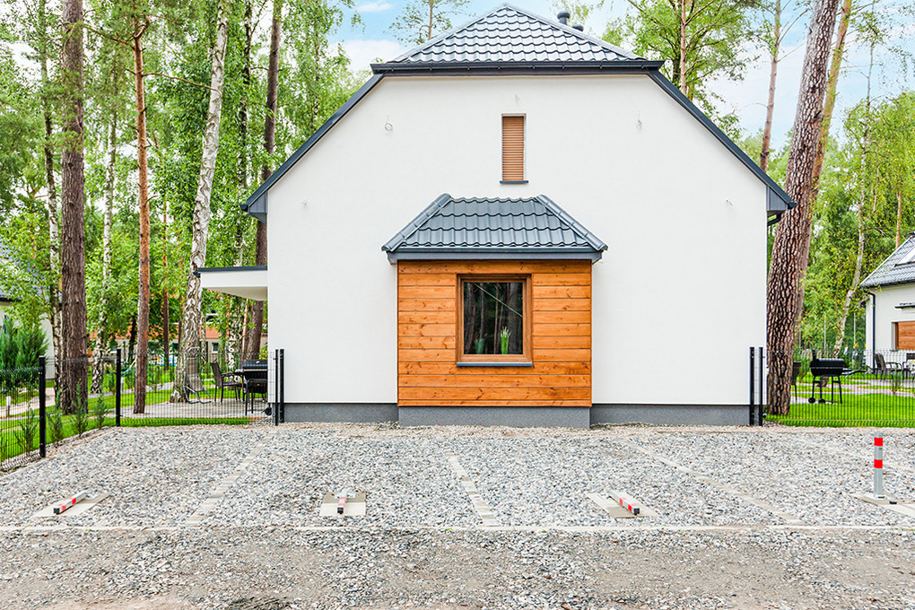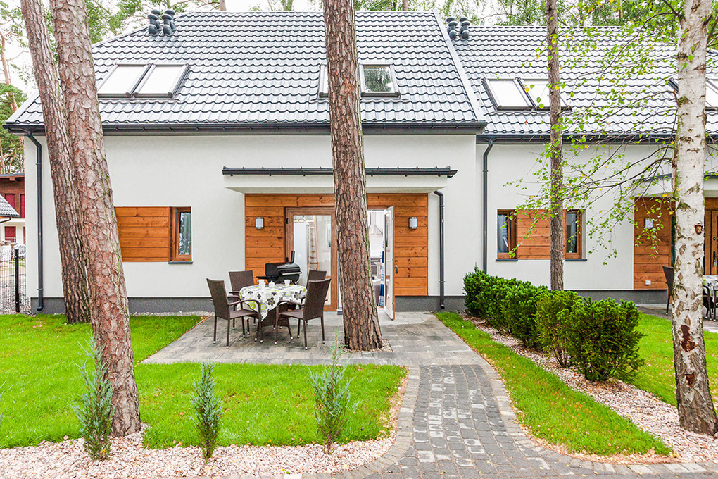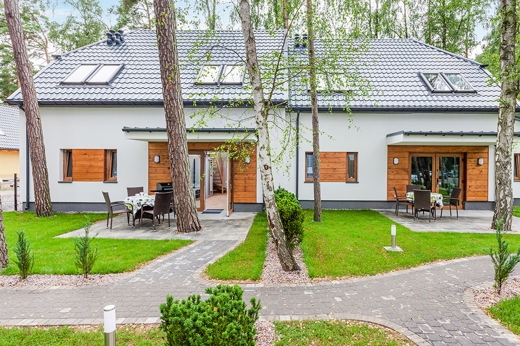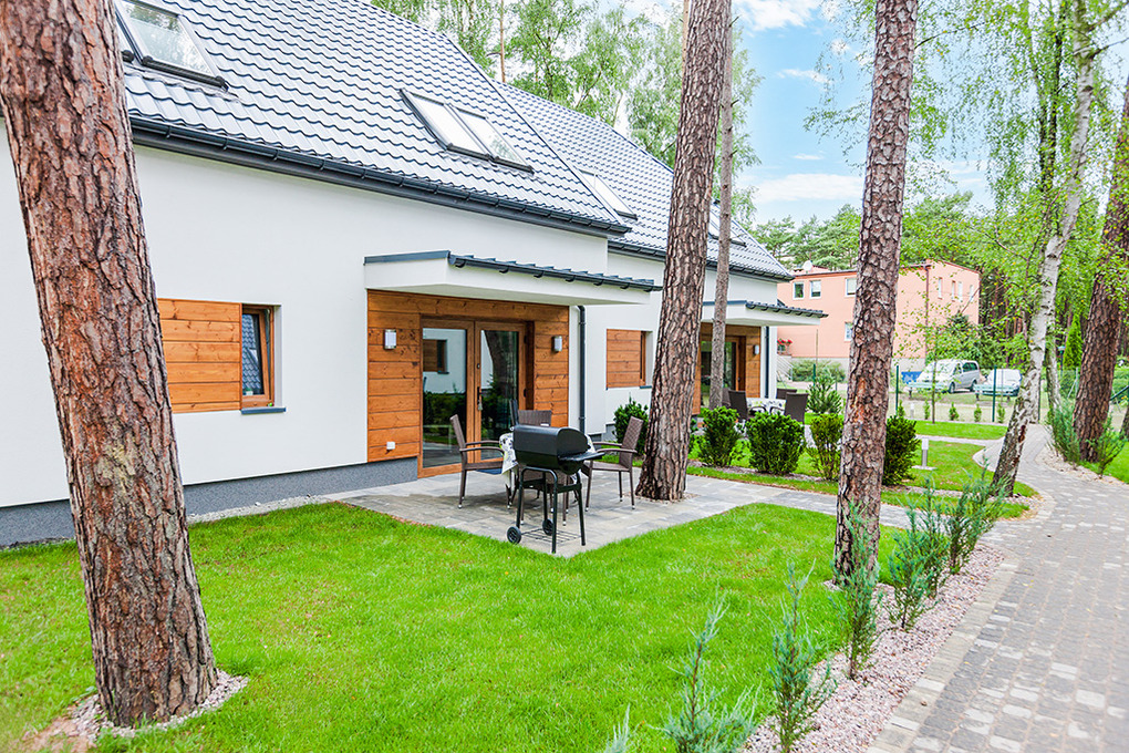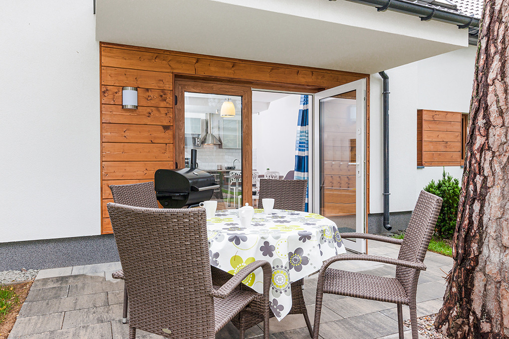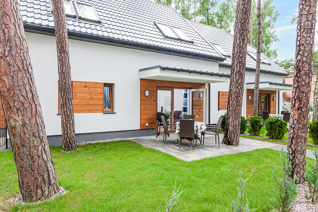 Haus: Schöne, gepflegte Ferienhausanlage auf einem umzäunten Grundstück am Waldrand. Komfortable Reihenhäuser, 2016 neu erbaut, mit geschmackvoller, moderner Einrichtung. Fußbodenheizung, E-Radiatoren. Warmwasser über E-Boiler (80 l). Terrasse, teilweise überdacht, davor kleiner Garten mit Rasenfläche. In der Anlage: Kinderspielplatz (Sandkasten, Schaukel, Klettergerüst, Rutsche). 1 Pkw-Stellplatz/Ferienhaus.