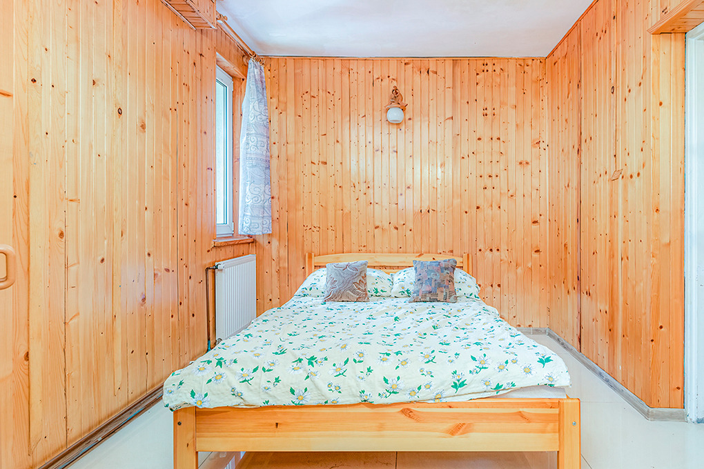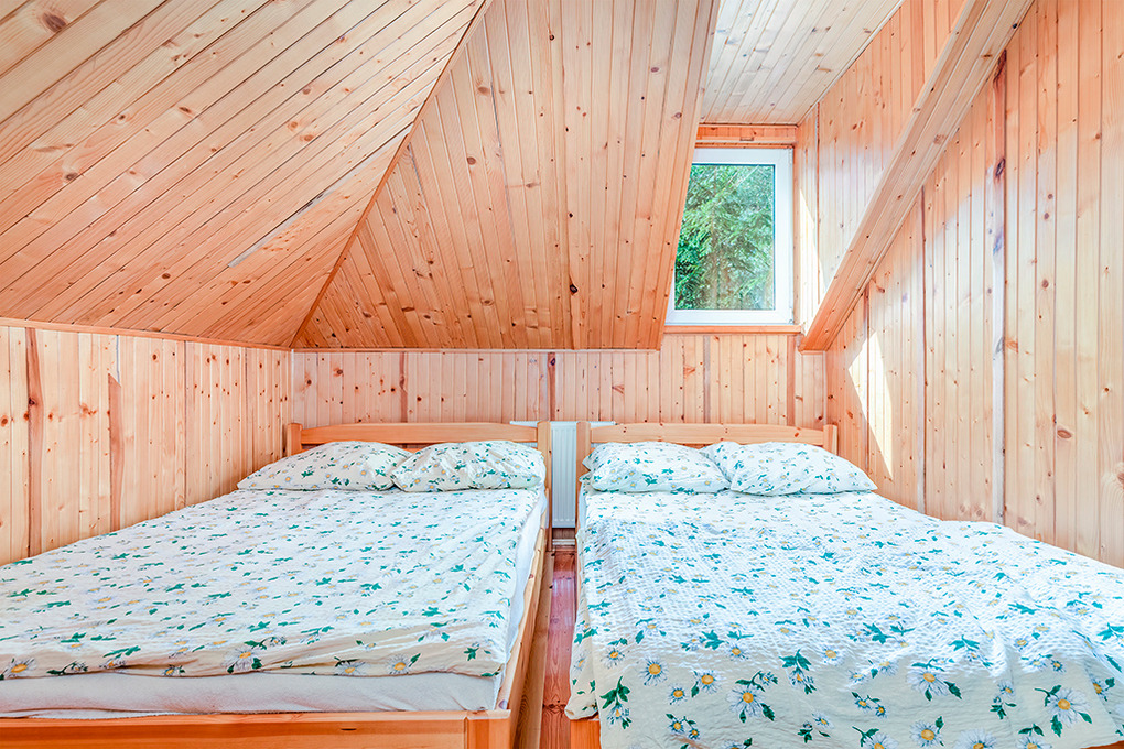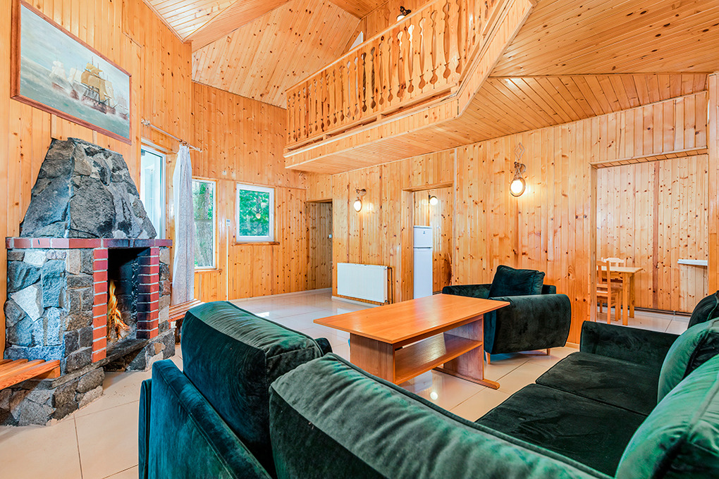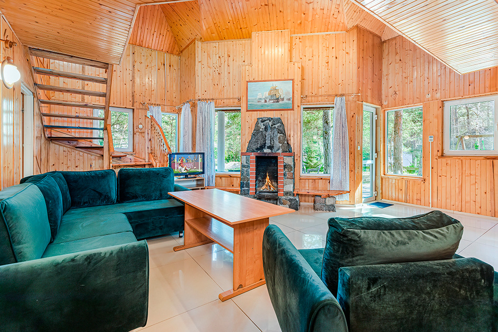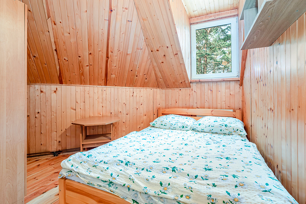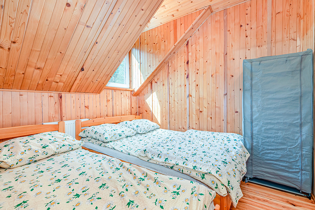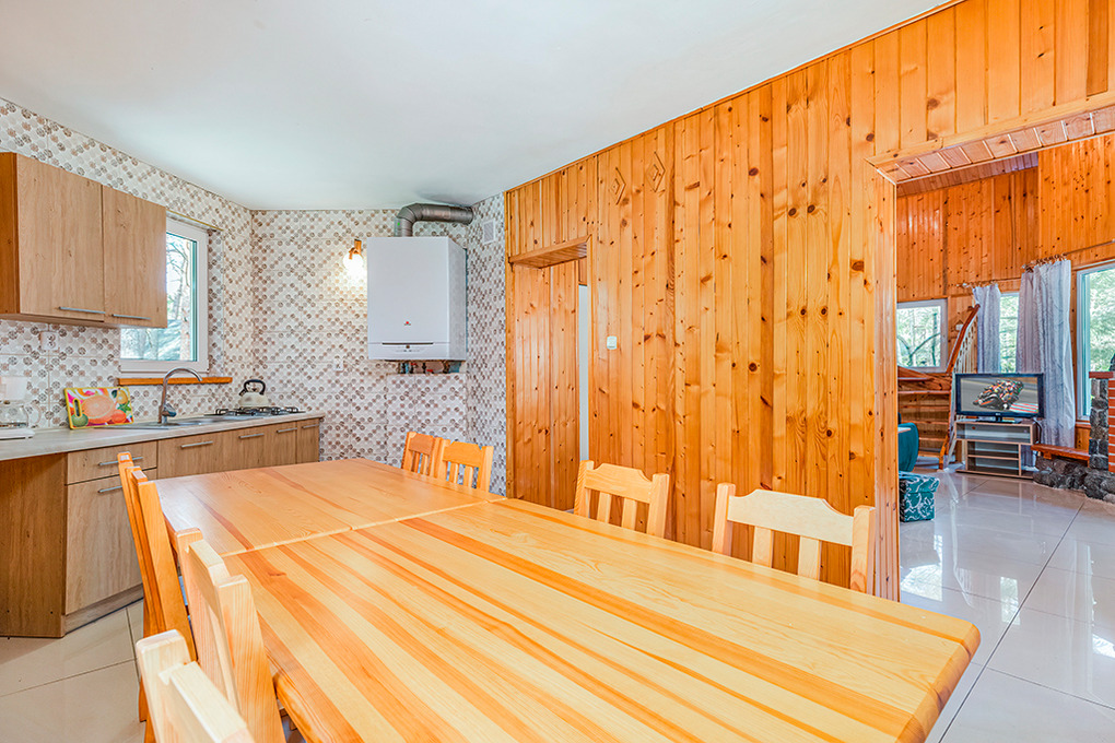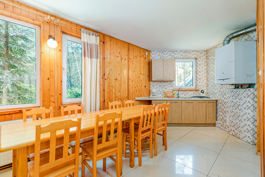 PL 30.12 Ferienhaus 8-16 Pers.: Großes 7-Zimmerhaus mit ca.150 qm Wohnfläche über 2 Etagen. Parterre: Großer Wohn-/Essraum, ausgebaut bis in den Dachgiebel, mit Kamin, Sitzecke mit 3 Sofas, 1 Sessel, Sat-TV, Esstischen, Küchenzeile (Gaskocher 4 Flammen, Tiefkühlfach 20 l, Spülmaschine). 2 Doppelzimmer. Bad: Du, Wb, WC. 1. Etage mit Schrägen: 2 Doppelzimmer. Zwei 4-Bettzimmer mit 2 Doppelbetten. Bad: Du, Wb, WC.