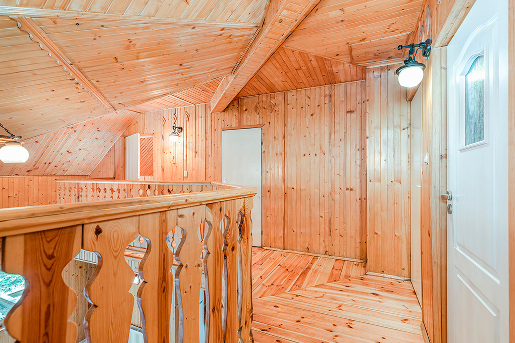 Haus: Gepflegte Ferienhausanlage mit einem großen Ferienhaus mit Kamin für 14 Personen (6 Schlafzimmer, 2 Bäder). Gemütliches Ambiente durch rustikale Holzvertäfelung im ganzen Haus. Freundliche Einrichtung. Spülmaschine. Kostenloses Internet (WiFi). Zentralheizung. Große Terrasse mit Außenkamin, Grill, Sitzmöbeln, herrlichem Blick in den Wald. Pkw-Stellplätze am Haus.