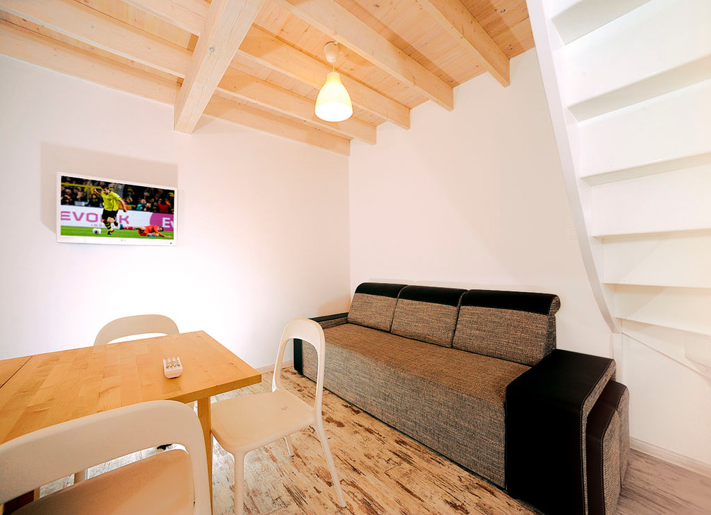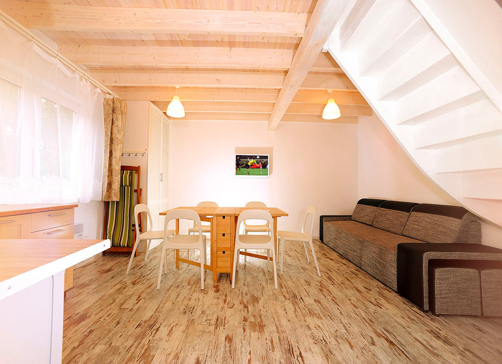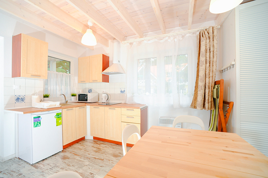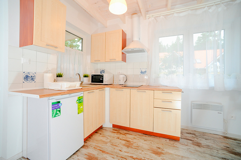 PL 30.19 Ferienhaus 3-5 Pers.: 3-Zimmerhaus mit 40 qm Wohnfläche über 2 Etagen. Parterre: Wohn-/Essraum mit Ausziehsofa (1 Pers.), Flachbild Kabel-TV, Esstisch, Küchenzeile (2 E-Platten, Mikrowelle). Bad/WC. 1. Etage: Doppelzimmer. 2 Bettzimmer.