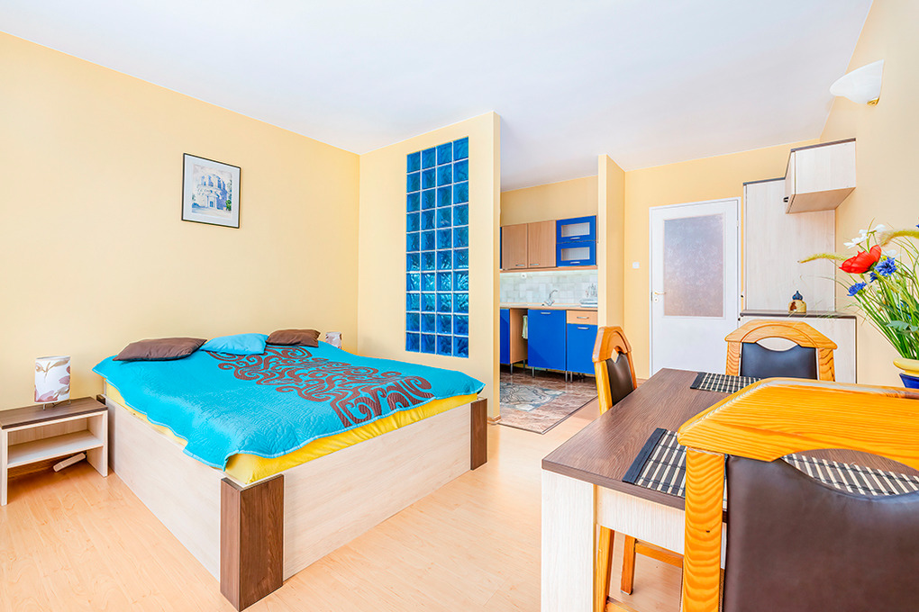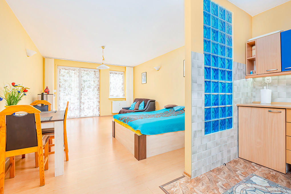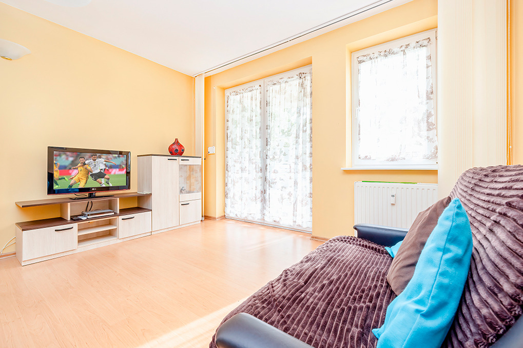 PL 30.33 Wohnung 2-3 Pers.: Schönes Studio mit 38 qm Wohnfläche, Parterre. Wohn-/Schlafraum mit Couchgarnitur (Ausziehcouch 1 Pers.), Flachbild Sat-TV, Esstisch, Küchenzeile (2 Pl. E-Herd), Doppelbett. Bad: Du, Wb, WC.