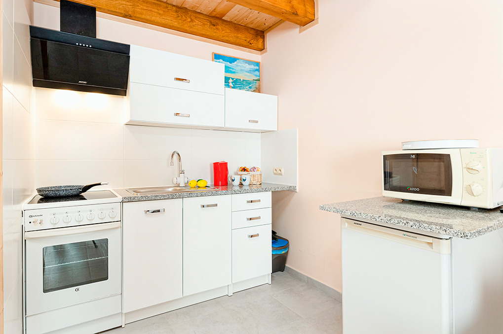 PL 31.12 Ferienhaus 2-4 Pers.: Neue 3-Zimmer-Haushälfte mit ca. 43 qm Wohnfläche über 2 Etagen. Heller, freundlicher Wohn-/Essraum mit rustikaler Holzbalkendecke, Sofa, Sat-TV (deutsche Programme), Esstisch, gut ausgestatteter Küchenzeile (Ceranfeld 4 Platten, Abzugshaube, Backofen, Mikrowelle). Bad: Du, Wb, WC. Treppe in die 1. Etage (Dachgeschoss): Doppelzimmer mit kleinem Balkon. 2-Bettzimmer.