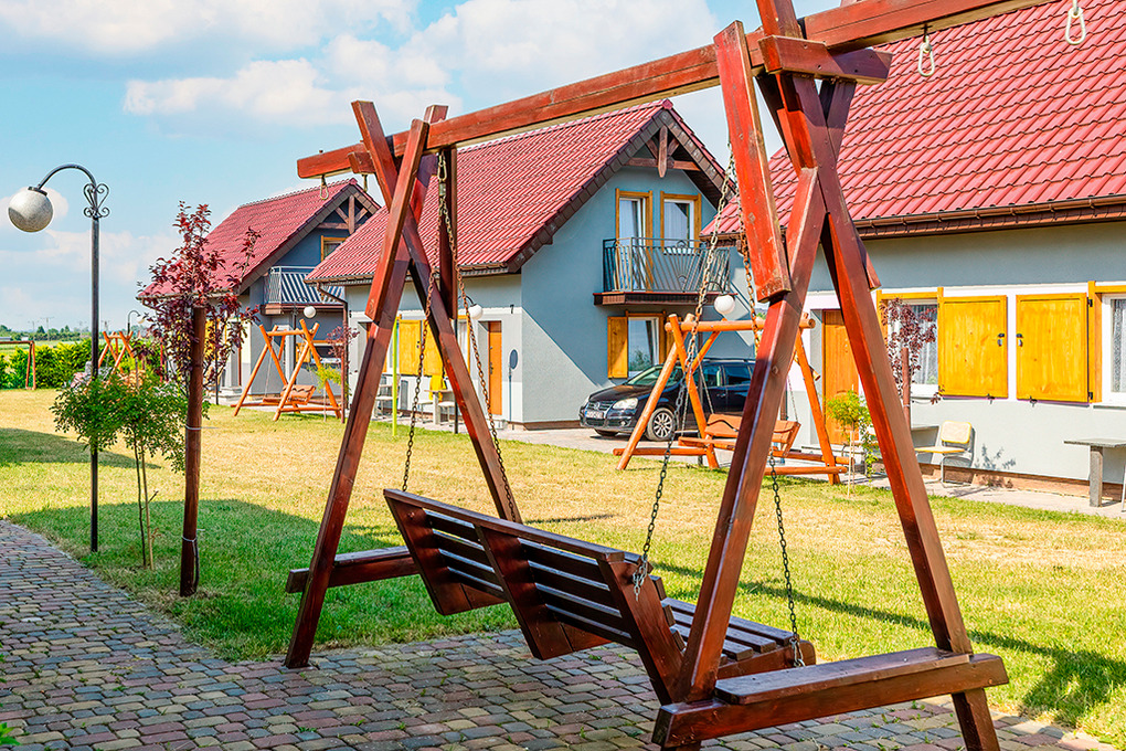 Haus: Kleine Ferienhausanlage mit insgesamt 6 Ferienhäusern, 2021 neu gebaut, auf einem großen, umzäunten Rasengrundstück (2.000 qm). Kleiner Spielplatz mit Trampolin, Klettergerüst.