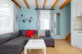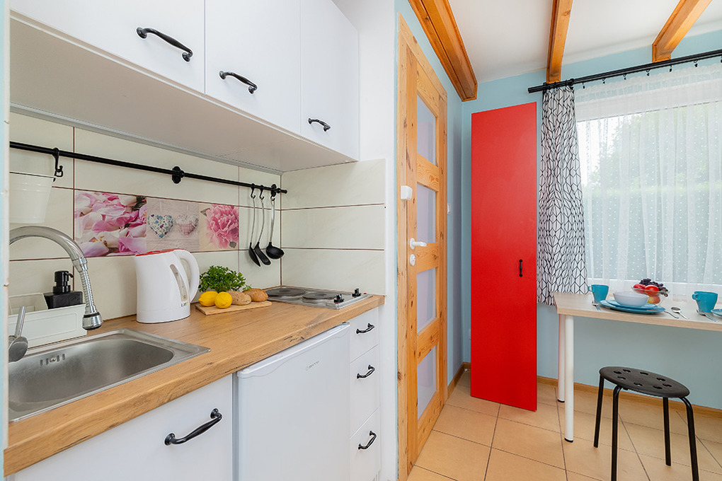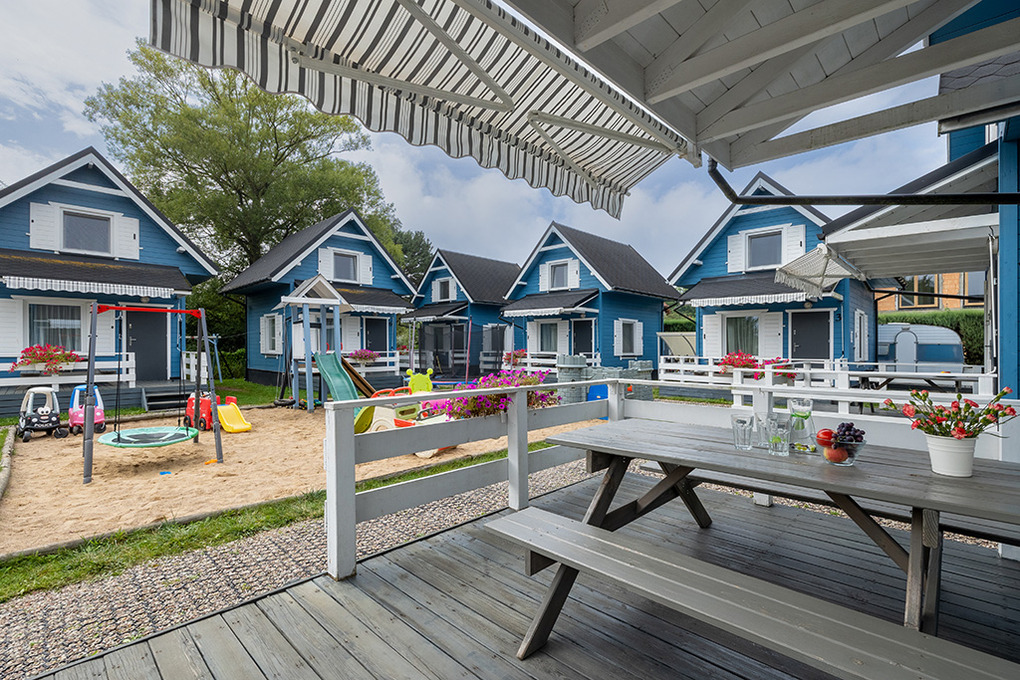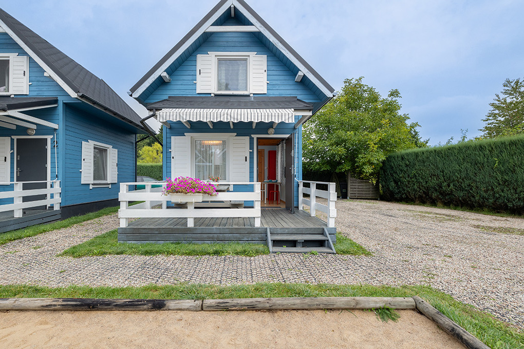 Haus: Schöne Ferienhausanlage mit 8 Holzblockhäusern. Freundliche Ferienhäuser mit funktionaler Einrichtung. Kostenloser Internetzugang (WiFi). Heizung mit E-Radiatoren, Warmwasser über E-Boiler (50 l). Terrasse mit Sitzmöbeln. In der Anlage: großer Kinderspielplatz. 1 Pkw-Stellplatz/Ferienhaus auf umzäuntem Grundstück.