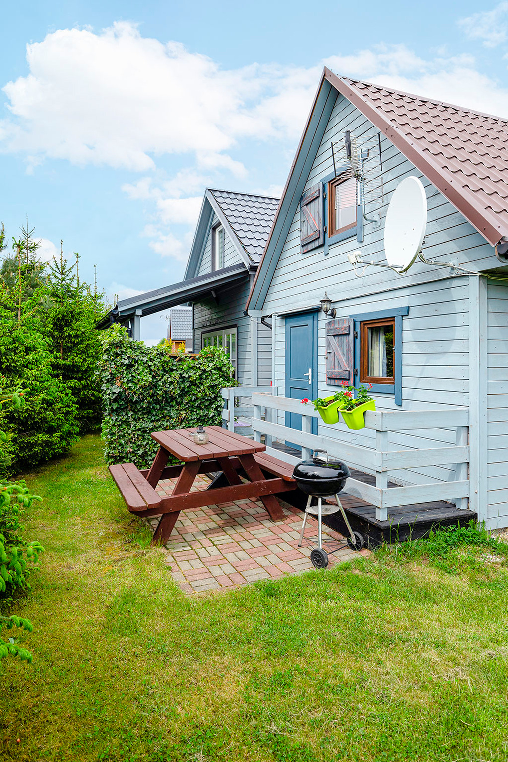 Haus: Drei schöne Ferienhäuser auf dem Grundstück des Vermieters. Wohnliche Einrichtung. Kostenloses Internet über W-Lan. Heizung mit E-Radiator, Warmwasser über E-Boiler (50 l). Terrasse mit Sitzmöbeln. 1 Pkw-Parkplatz/Ferienhaus auf dem abgeschlossenen Grundstück.