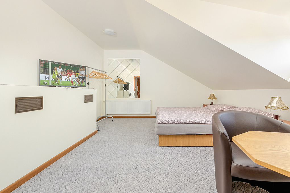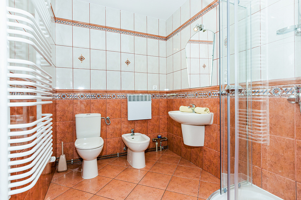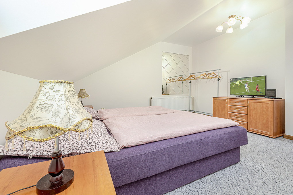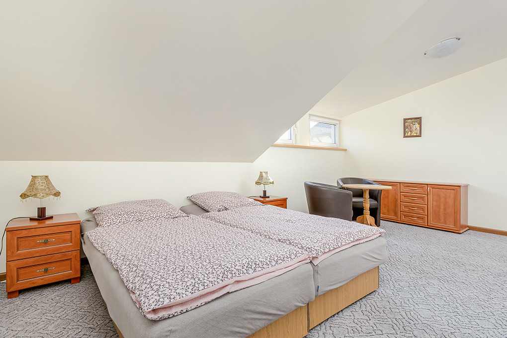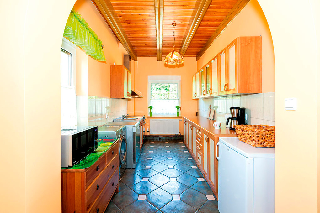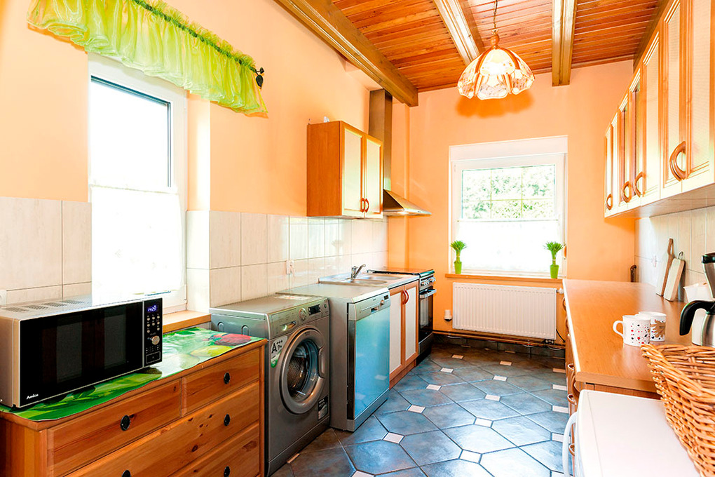 PL 33.9 Ferienhaus 4-8 Pers.: Komfortables 4-Zimmerhaus mit 100 qm Wohnfläche über 2 Etagen. Parterre: Wohn-/Essraum mit schöner Holzbalkendecke, Sitzgarnitur (Ausziehsofa 2 Pers.), Sat-TV (deutsche Programme), Esstisch. Offene Küche (Backofen, Mikrowelle, Spülmaschine, Waschmaschine). Bad: Du, Wb, Bidet, WC. 1. Etage: 3 Doppelzimmer. Bad: Wb, WC.