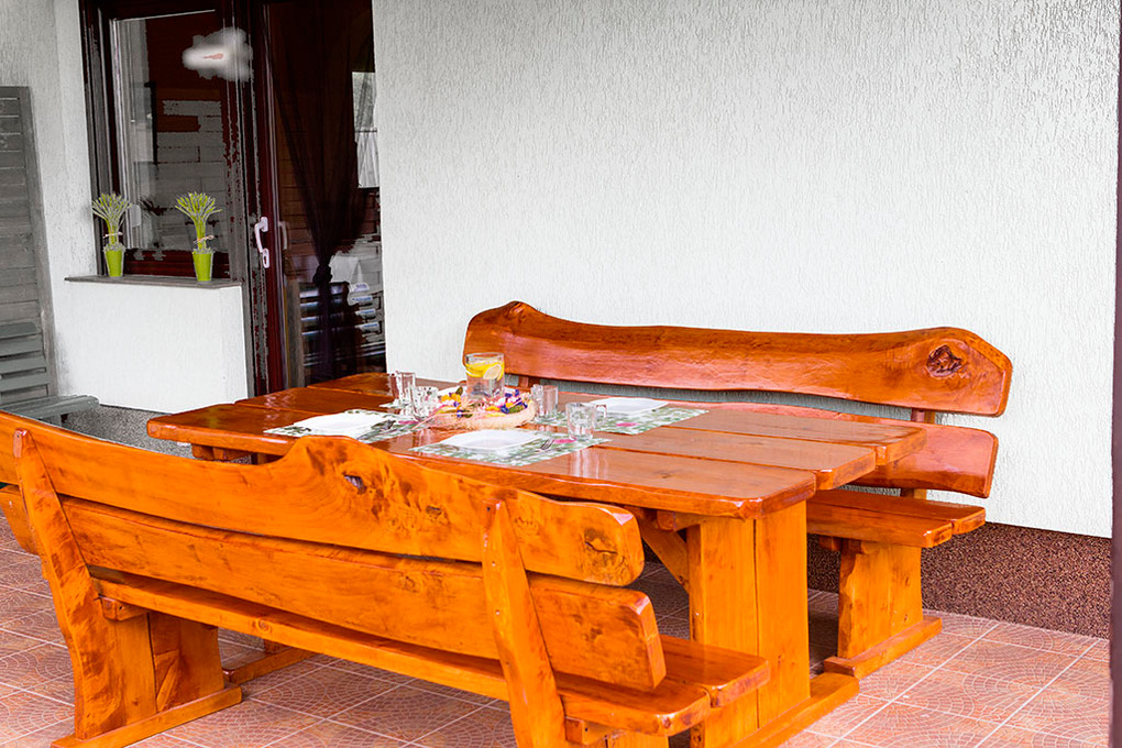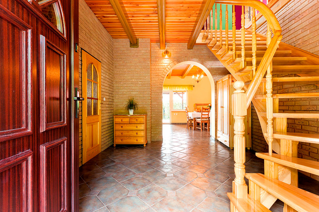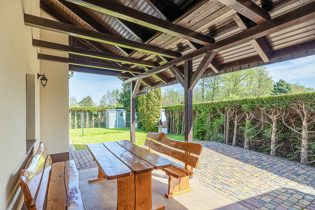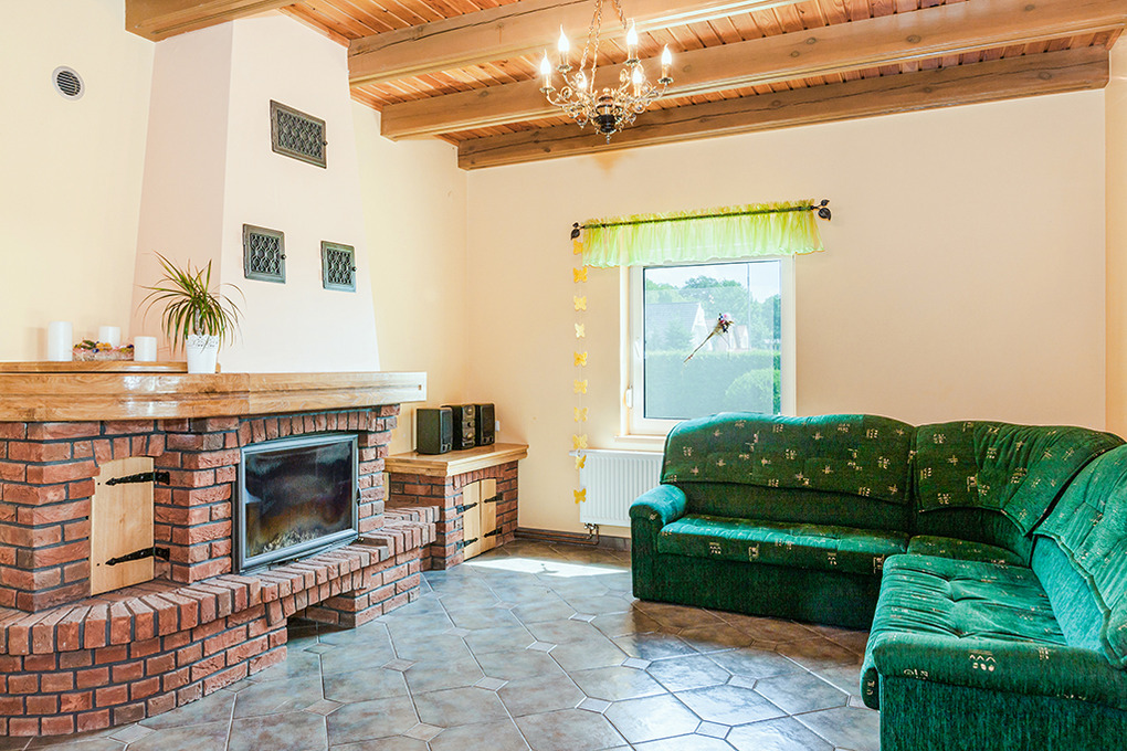 Haus: Großzügiges Ferienhaus mit Kamin (nur zur Dekoration) in einem schönen Wohnviertel. Rustikale, gemütliche Einrichtung. Zentralheizung. Kostenloser Internetzugang über W-Lan. Teilüberdachte Terrasse mit Sitzmöbeln. Parkplatz auf umzäuntem Grundstück.