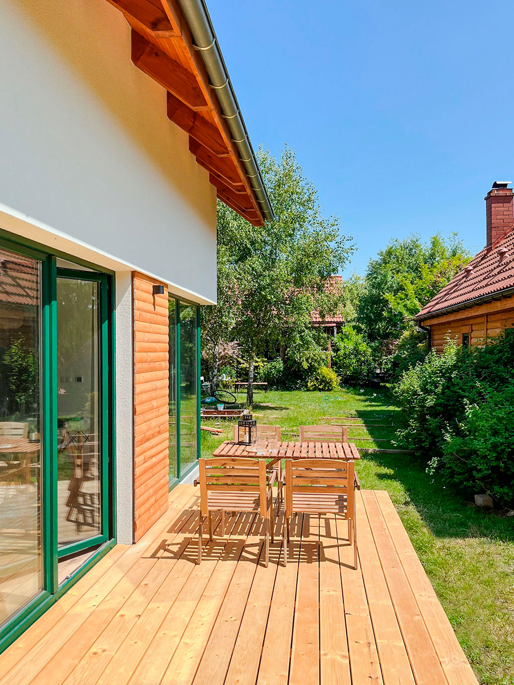Haus: Komfortable Reihenhäuser mit geschmackvoller Einrichtung. In der weitläufigen Anlage: Separates Saunahäuschen mit Relax-Terrasse. Angelteich. Grillplatz. Waschmaschine. Großer Garten mit Kinderspielplatz (Schaukel, Rutsche, Sandkasten). 5 Fahrräder ausleihbar. Parkplatz auf dem umzäunten Grundstück.