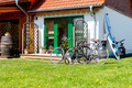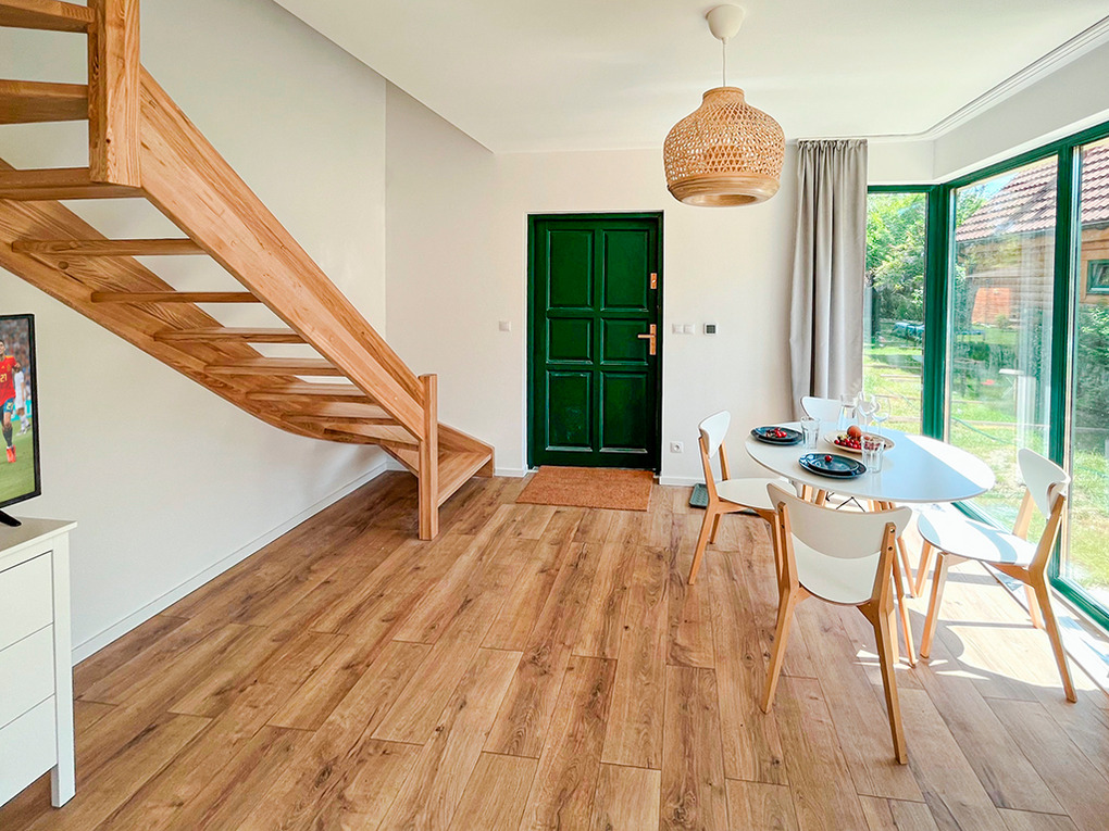 Haus: Komfortable Reihenhäuser mit geschmackvoller Einrichtung. In der weitläufigen Anlage: Separates Saunahäuschen mit Relax-Terrasse. Angelteich. Grillplatz. Waschmaschine. Großer Garten mit Kinderspielplatz (Schaukel, Rutsche, Sandkasten). 5 Fahrräder ausleihbar. Parkplatz auf dem umzäunten Grundstück.