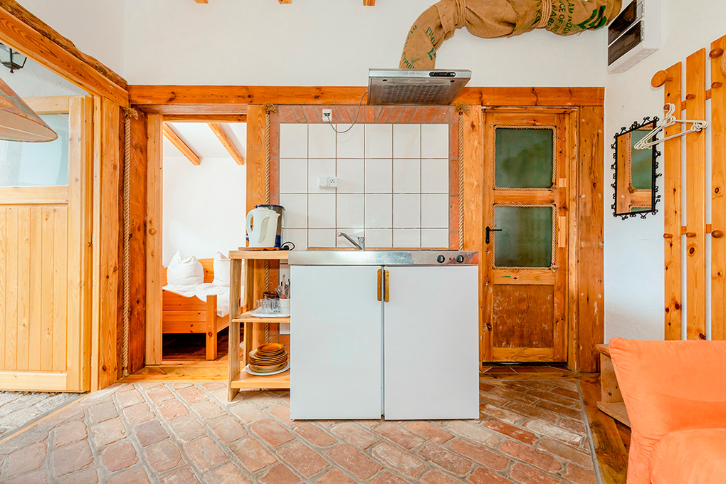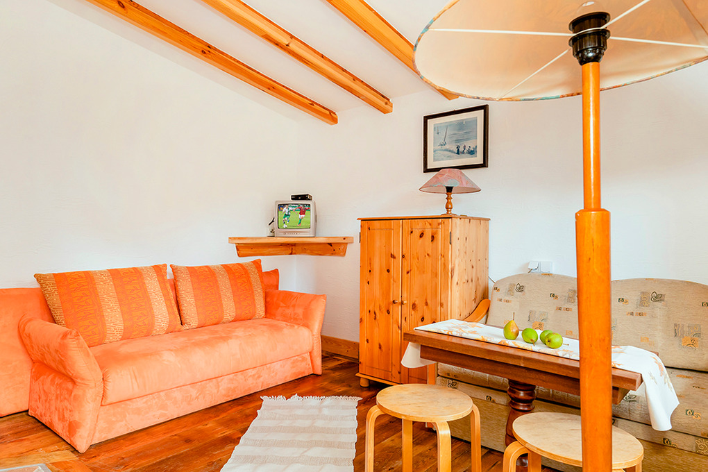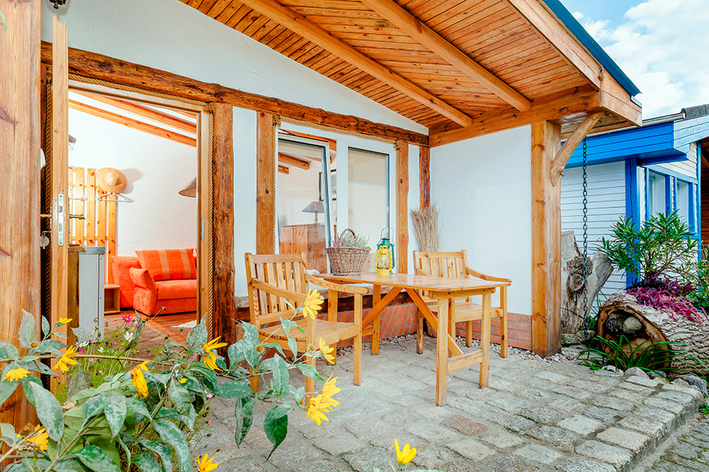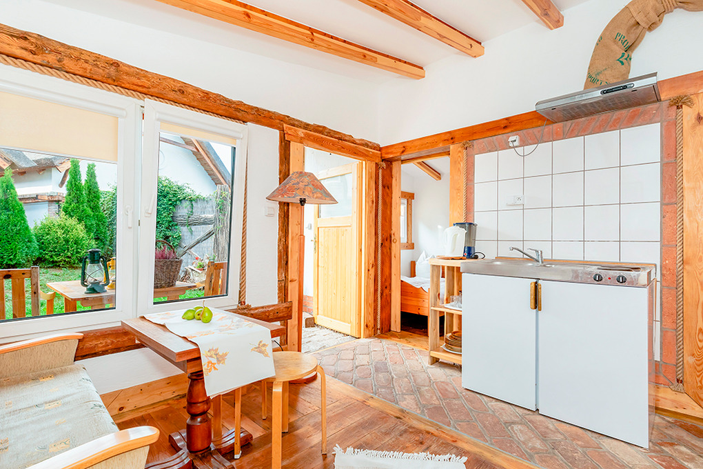 PL 34.22 Ferienhaus 1-4 Pers.: Rustikales 2-Zimmerhaus mit ca.30 qm Wohnfläche. Wohn-/Essraum mit 2 Sofas (Schlafcouch 2 Pers.), kleinem Tisch, Sat-TV mit deutschen Programmen, Pantryküche (2 E-Platten, Abzugshaube). Doppelzimmer. Bad/WC. Schöne überdachte Terrasse mit Sitzmöbeln.