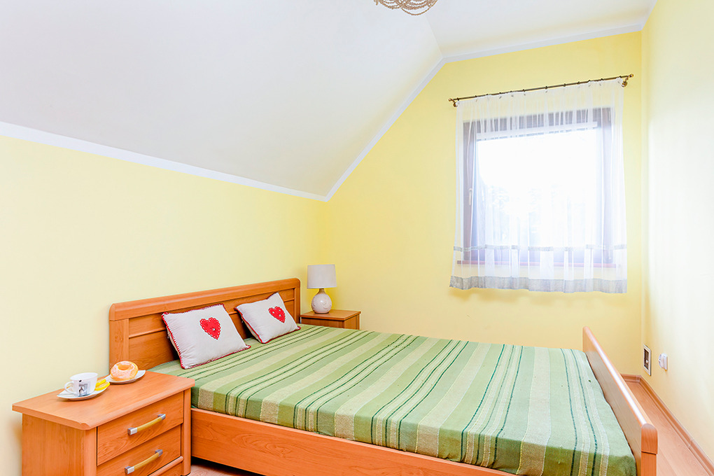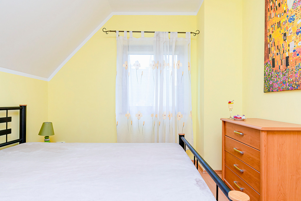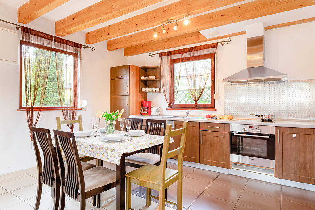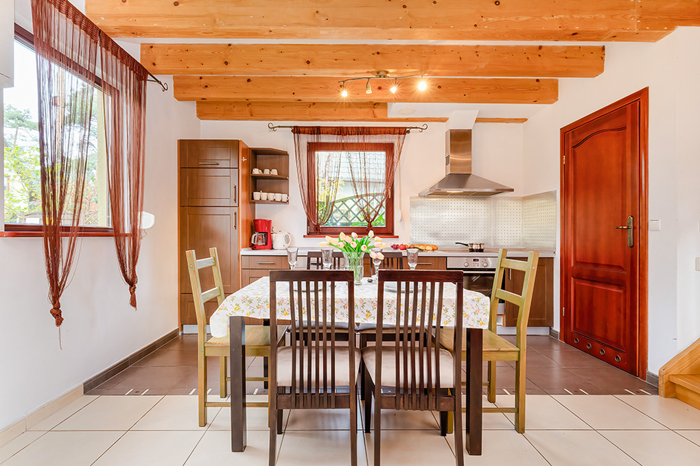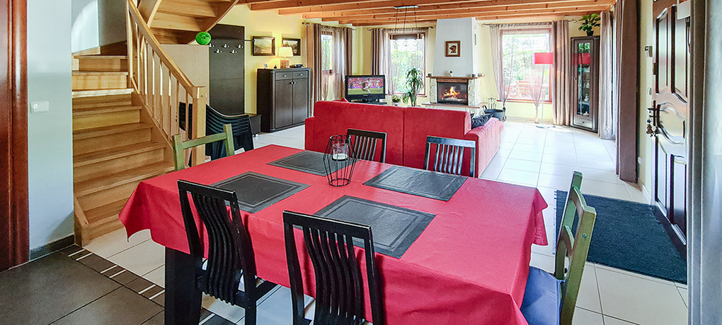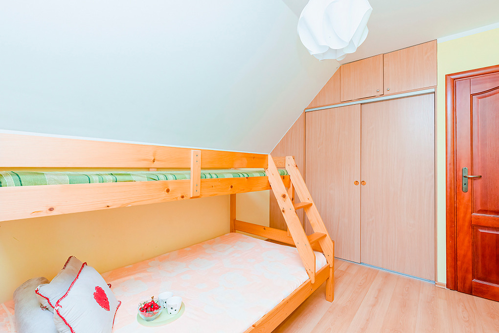 PL 36.1 Ferienhaus 2-7 Pers.: 4-Zimmerhaus mit ca. 90 qm Wohnfläche über 2 Etagen. Parterre: Schöner, großzügiger Wohn-/Essraum mit Kamin, Sitzgarnitur, Sat-TV, Esstisch, gut ausgestatteter Einbauküche (Backofen, Spülmaschine, Mikrowelle). Bad/WC. 1. Etage: Zwei Doppelzimmer, jeweils mit franz. Bett. 3-Bettzimmer mit Etagenbett für 3 Personen (unten 140 cm, oben 80 cm breit). Bad/WC.