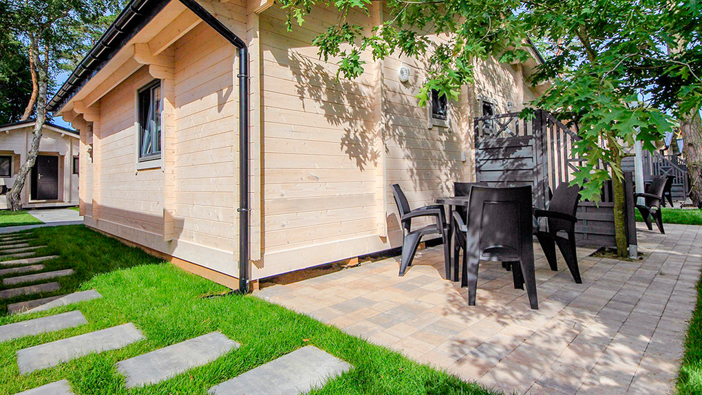 Schöne Ferienhäuser mit freundlicher Einrichtung im Chaletstil. Warmwasser über E-Boiler. Heizung über E-Radiatoren. Kleine Terrasse mit Sitzmöbeln, davor Rasenfläche. 1 Pkw-Stellplatz/Haus auf dem umzäunten Grundstück im Mietpreis inklusiv.