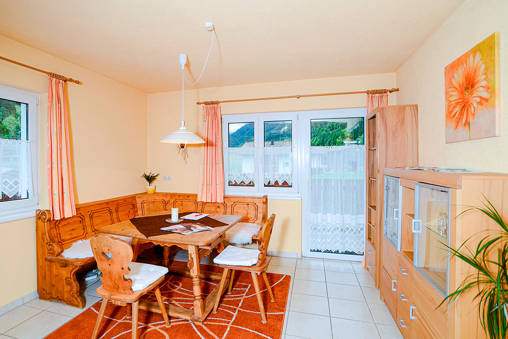 Parterre: Flur mit Garderobe, Schuhregal. Gemütlicher Wohnraum mit Kaminofen, Couchgarnitur, Sat-TV, Sitzecke. Große, helle Wohnküche mit großem Esstisch, moderner Küchenzeile (Backofen, Spülmaschine), zusätzlichem Holzherd. Vorratsraum. Separates WC.