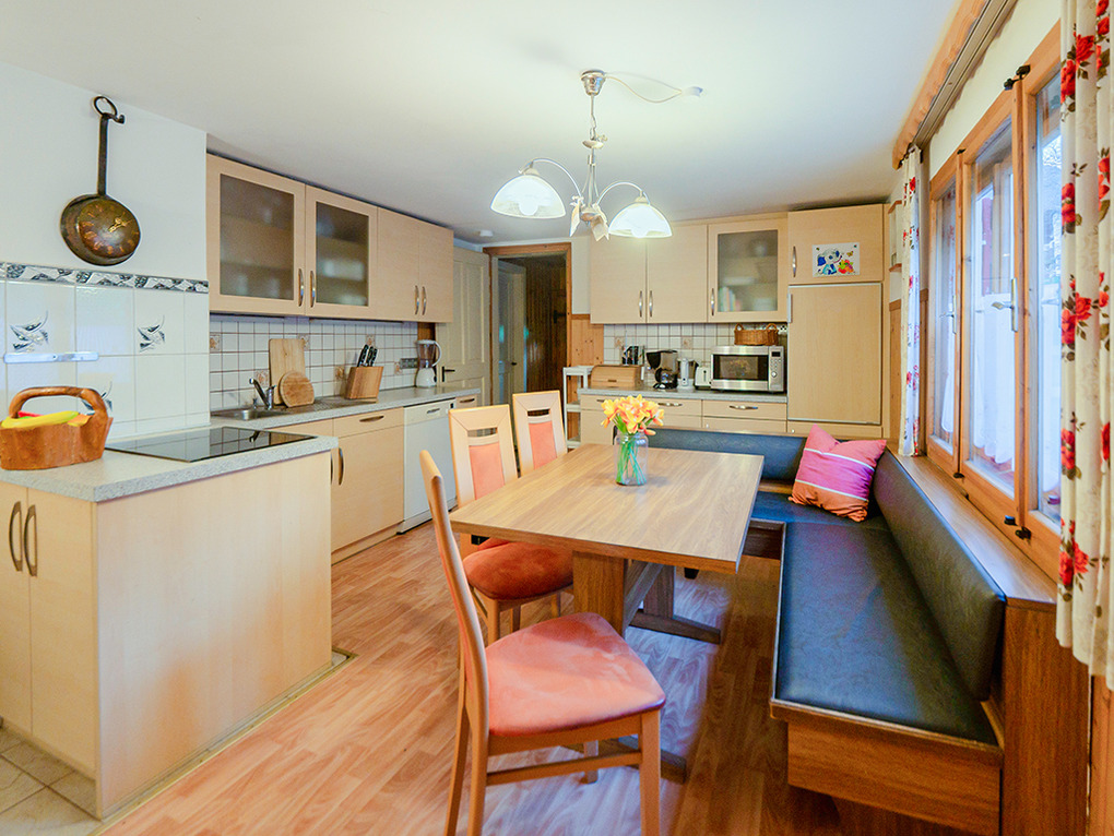 Parterre: Montafoner Stube mit Esstisch, Eckbank, Sitzgarnitur, Sat-TV. Große, helle Küche mit großem Esstisch, moderner Küchenzeile (Backofen, Mikrowelle, Spülmaschine). Doppelzimmer. Bad: Du, Wb, WC.