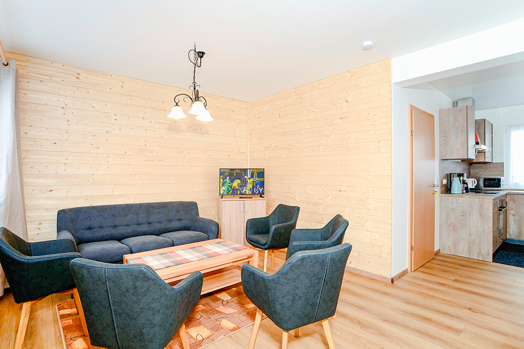 A 64.10 Chalet 6-8 Pers.: Modernes 5-Zimmerhaus mit 160 qm Wohnfläche über 2 Etagen. Parterre: Heller, gediegener Wohnraum mit Esstischen, Sat-TV, DVD-Player. Moderne Küche mit Küchenzeile (Backofen, Mikrowelle, Spülmaschine). Doppelzimmer. Bad: Du, Wb, WC. Separates WC. 1. Etage: 3 Doppelzimmer. 2 Bäder, jeweils mit Du bzw. Bw/Du, Wb, WC.