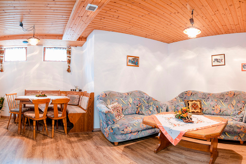 Parterre: Gemütlicher holzvertäfelter Aufenthaltsraum mit Sitzecken, Sat-TV. Gruppenküche mit 4 Pl. E-Herd, Backofen, Spülmaschine. 2-Bettzimmer mit Wb.