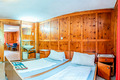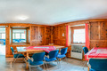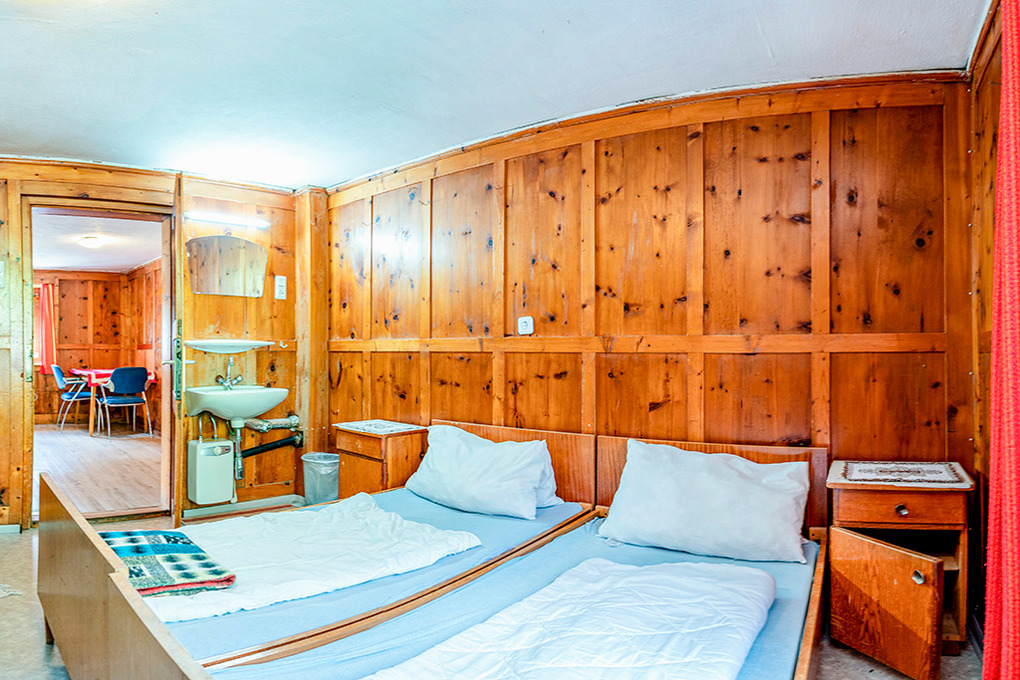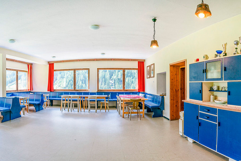 Parterre: Großer Aufenthaltsraum mit Esstischen, Sat-TV, Panoramafenstern. Zweiter gemütlicher holzvertäfelter Aufenthaltsraum. Gruppenküche mit 4 Pl. E-Herd, Backofen, zusätzlichem Holzherd. Vorratsraum mit 2 Tiefkühlschränken à 80 l. 4-Bettzimmer mit Doppelbett, Etagenbett, Wb. Duschraum mit 2 Einzelduschen. Separate Dusche. Separates WC.