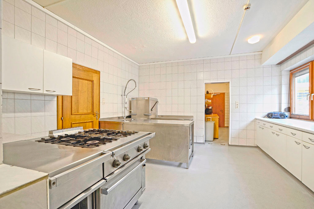 Parterre: Freundlicher Eingangsbereich mit Sitzgruppe. Große, helle Gaststube (40 qm) mit TV, Theke, Bierzapfanlage. 2. großzügige Gaststube mit sehr schönem Panoramablick, Terrasse. Professionelle Hotelküche mit Backofen, Tiefkühltruhe, Spülmaschine. Vorratsraum.