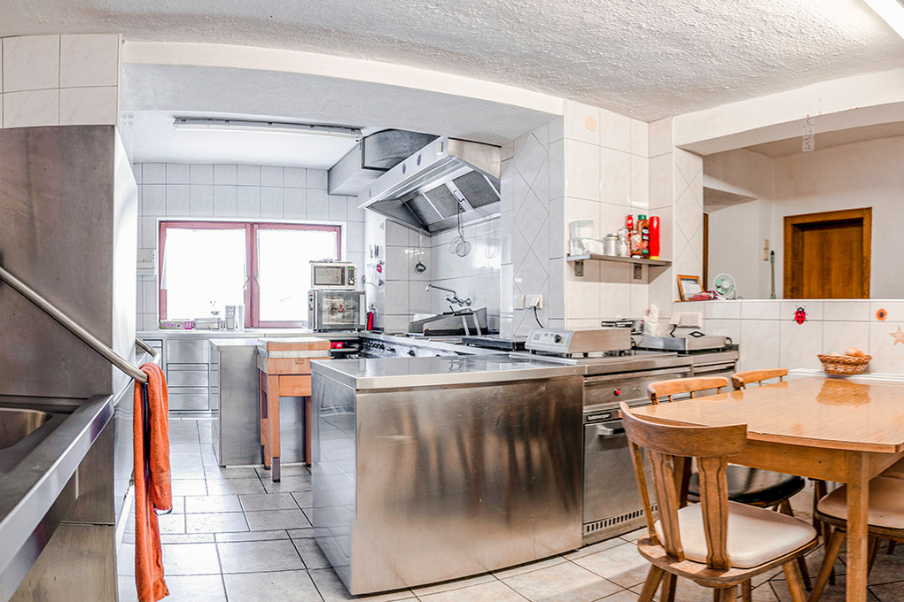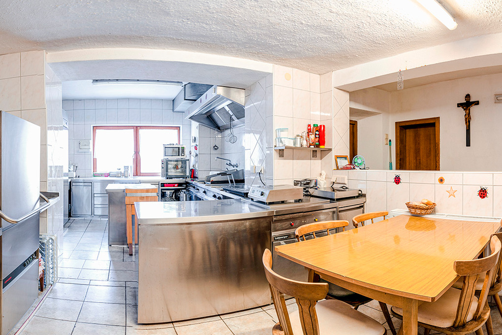 Parterre: Großer gemütlicher holzvertäfelter Aufenthaltsraum mit Sitzecken, Sat-TV. Professionelle Gruppenküche mit Induktions-Großkochfeld, Backofen, Tiefkühlschrank, Spülmaschine.