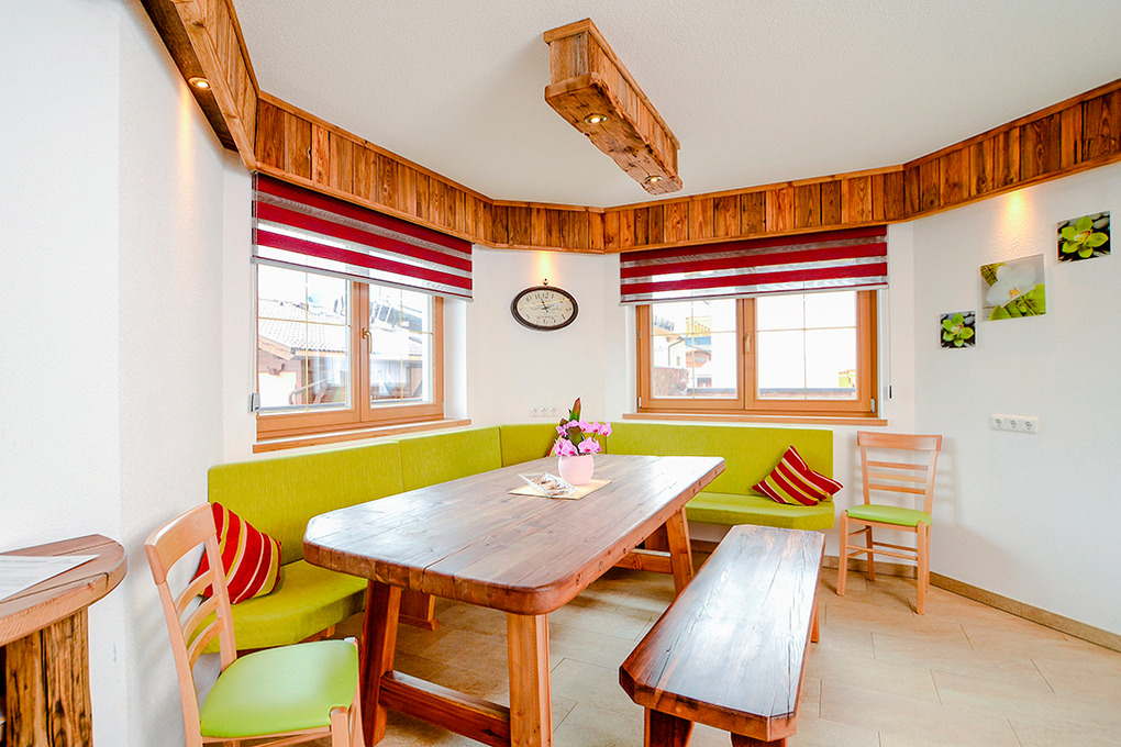 Parterre: Eingangsbereich mit Garderobe. Schöner, großer Wohn-/Essraum (36 qm) mit original Ötztaler Bauernofen, Couchgarnitur, Sat-TV, Esstisch, sehr gut ausgestatteter Küchenzeile (Backofen, Mikrowelle, Spülmaschine). Doppelzimmer. Separates WC.