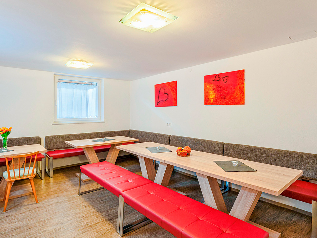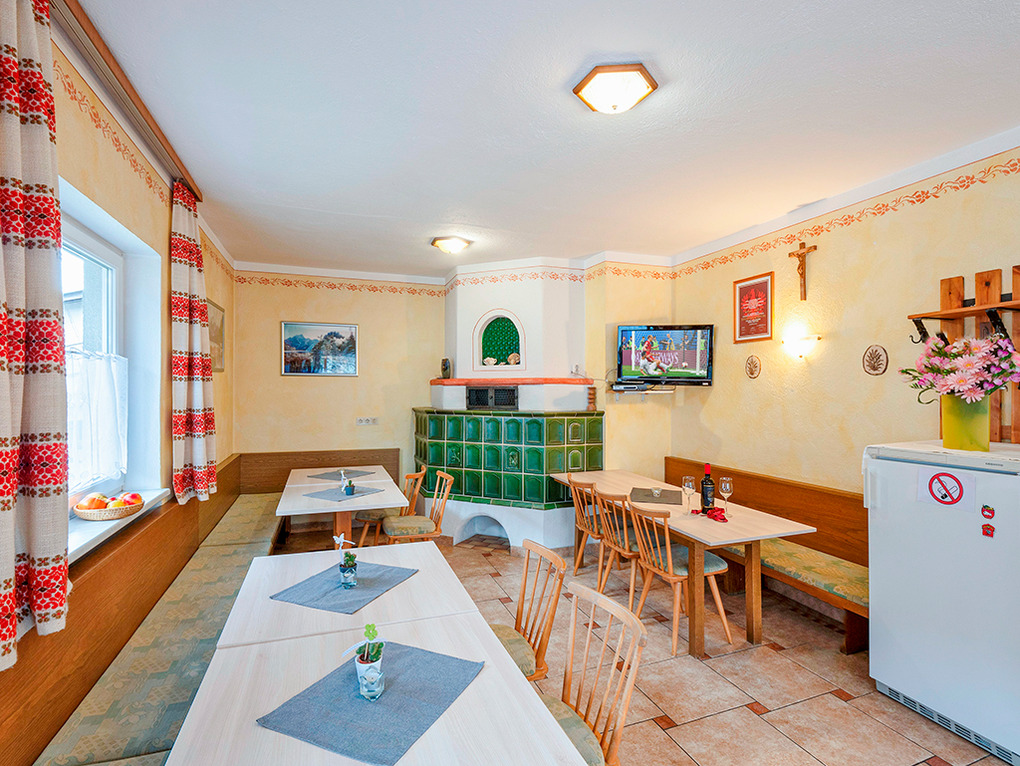 Parterre: Aufenthaltsraum (35 qm) mit schönem Kachelofen, Esstischen, Sat-TV. 2 separate WCs