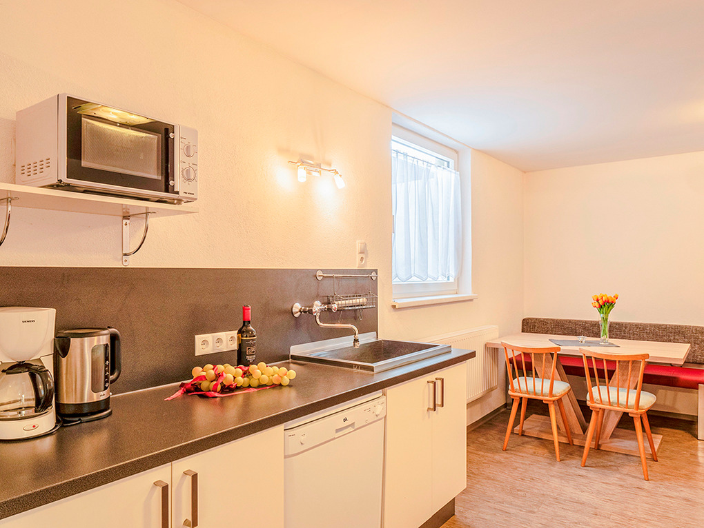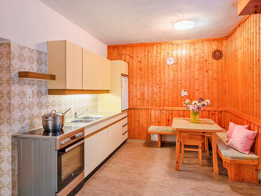 Keller: Wohnküche mit Esstischen für 23 Personen, gut ausgestatteter Küchenzeile (4 E-Platten, Backofen, Spülmaschine), zusätzlichem Holzherd. Vorratsraum.