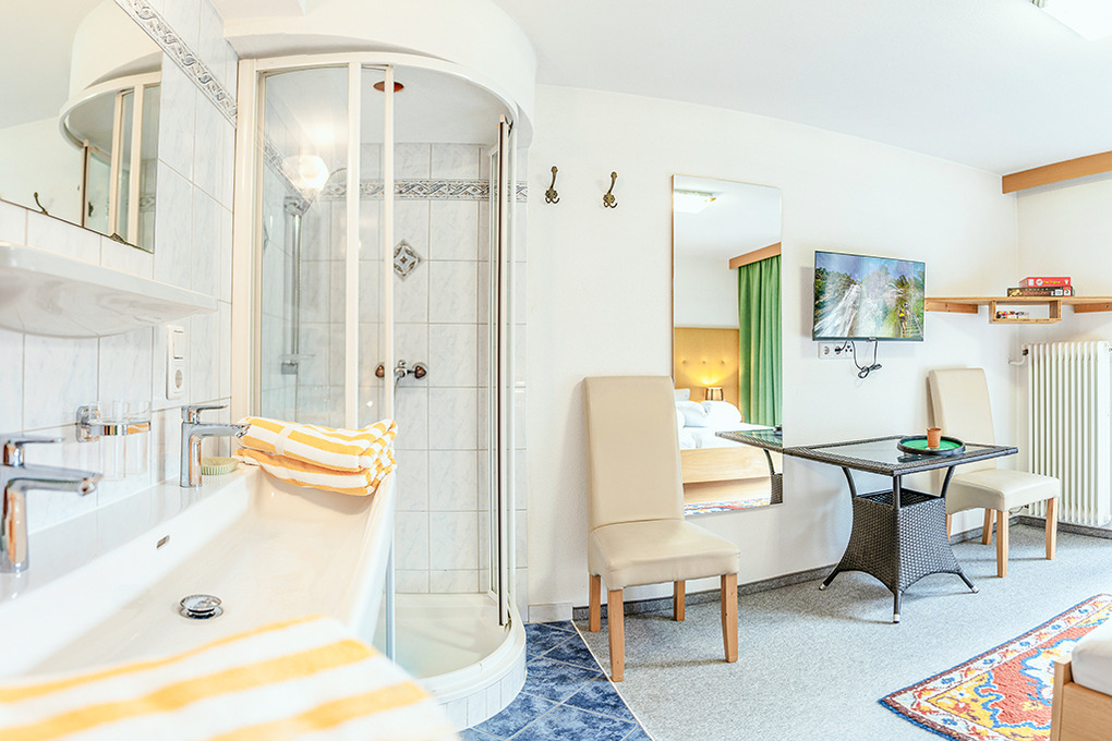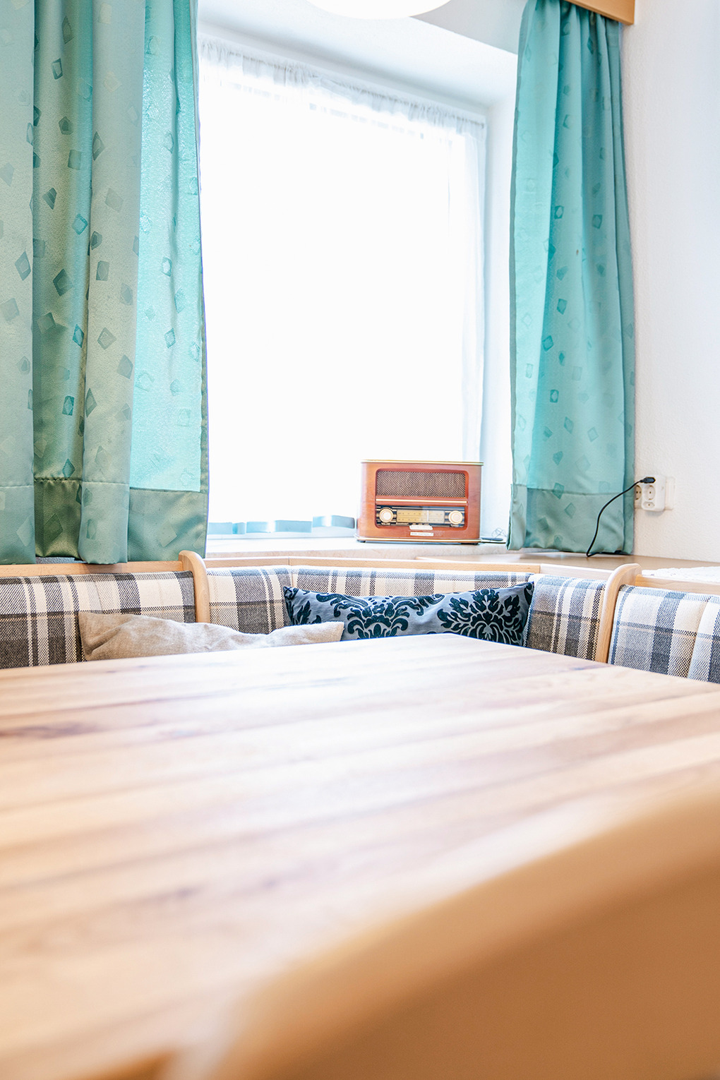 A 154.8 Wohnung 1-5 Pers.: 2 1/2-Zimmerwohnung mit 70 qm Wohnfläche, 1. Etage. Gemütliche Wohnküche mit Esstisch, gut ausgestatteter Küchenzeile (Backofen, Mikrowelle, Spülmaschine), Sat-TV. Doppelzimmer mit Sat-TV, Du, Wb, Balkon. 3-Bettzimmer mit Doppelbett, Schlafcouch, Balkon. Bad: 2 Wb, Bw/ Du. Separates WC.