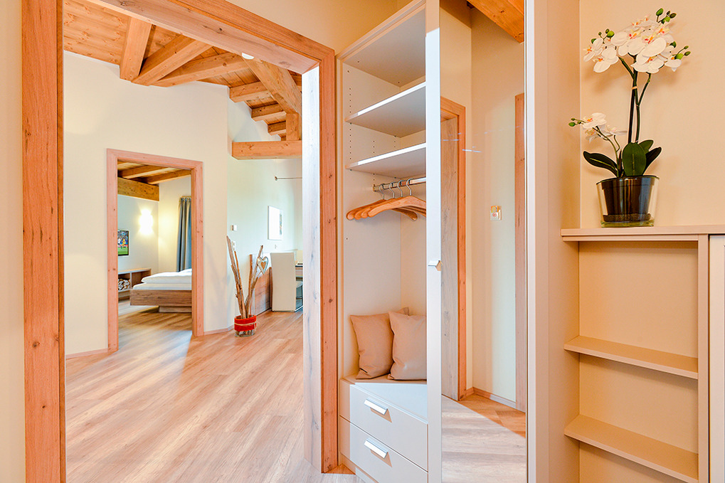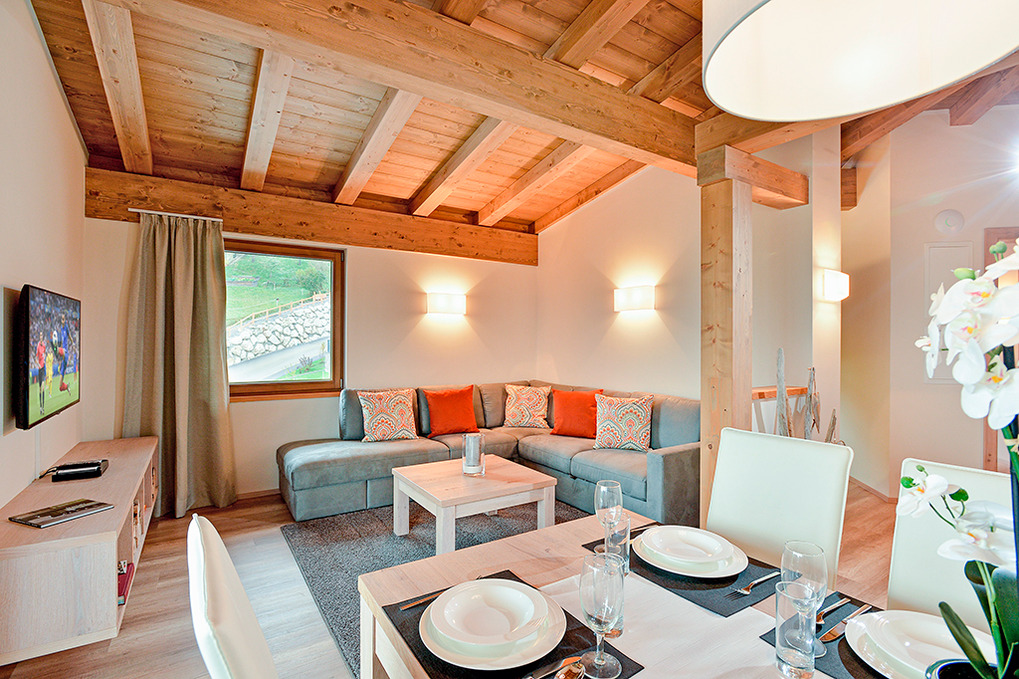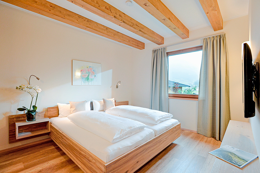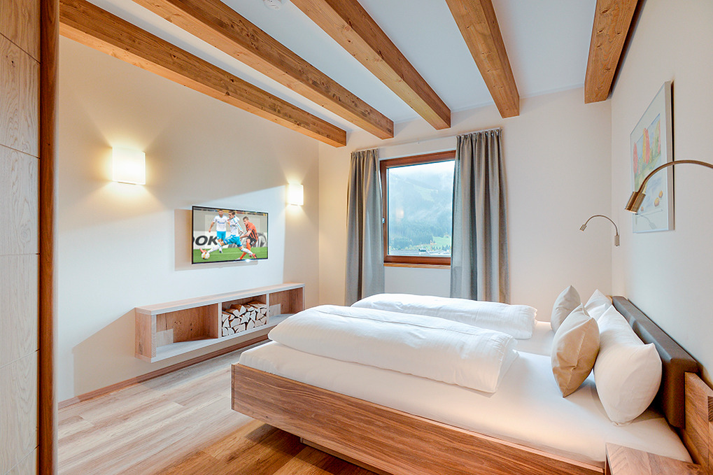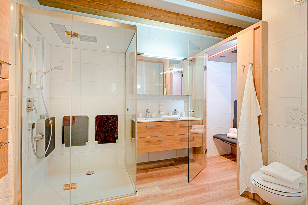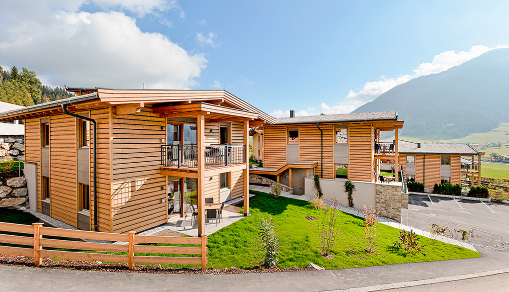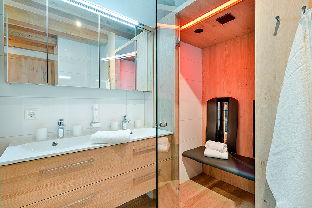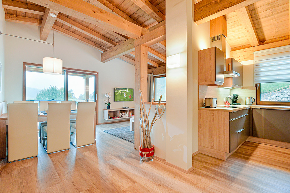 Haus: Moderne Chaletsiedlung in reizvoller Hanglage. Jedes Chalet beherbergt 2 großzügige, geschmackvoll eingerichtete Ferienwohnungen, alle mit Infrarotsauna und Dampfdusche. Gemütliches Chalet-Ambiente durch rustikal-moderne Holzbalkendecke und große Panoramafenster mit herrlichem Blick auf die Berge. Moderne hochwertige Einrichtung. Kostenloser Internetzugang über WLan. Zentralheizung. Große Terrasse oder Balkon (ca. 20 qm) mit Sitzmöbeln. 1 Tiefgaragenstellplatz pro Fewo. In der Anlage: Spielraum mit Tischfußball, Kinderspielzeug. Kinderspielplatz mit Trampolin, Rutsche, Schaukel.