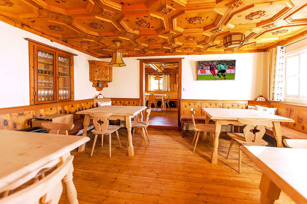 Parterre: Flur. Zirbenholzvertäfelte Stube mit Esstischen, Eckbänken. Zweiter zirbenholzvertäfelter Aufenthaltsraum mit Sat-TV. Bauernküche mit Backofen, Spülmaschine, zusätzlichem Holzherd, Esstisch, Sat-TV. Separates WC.