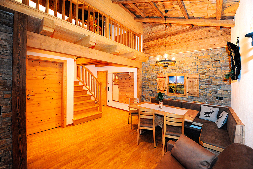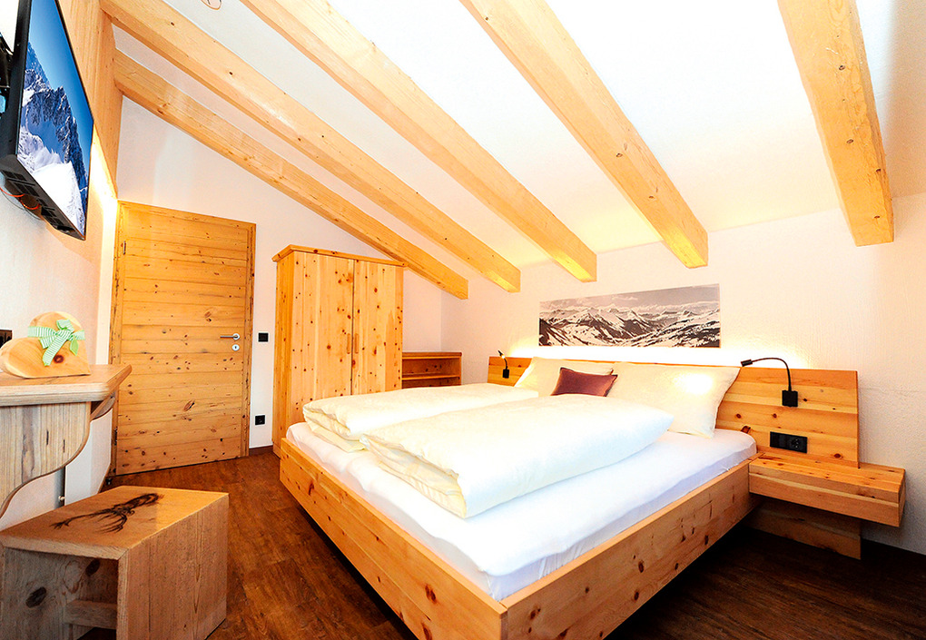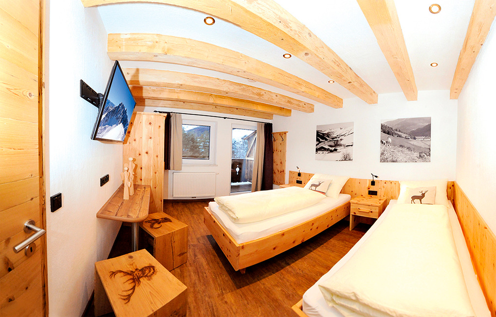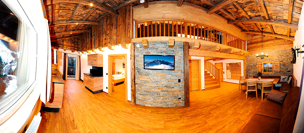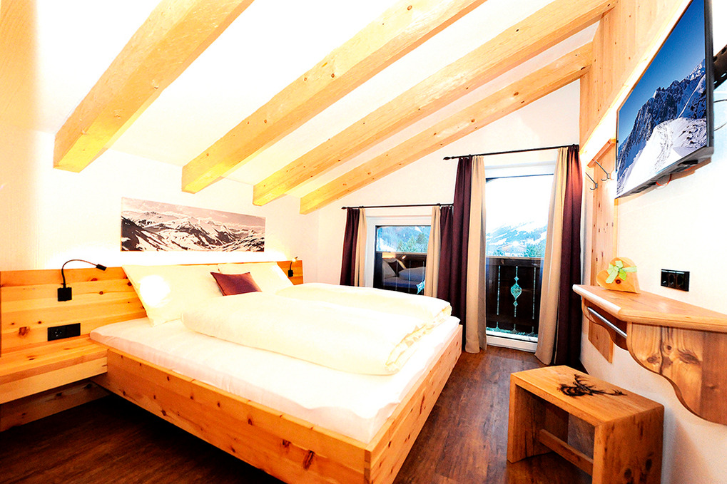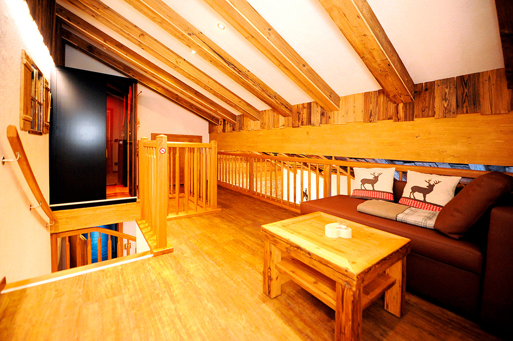 A 371.15 Wohnung 1-4 Pers.: 3-Zimmerwohnung mit 80 qm Wohnfläche über 2 Etagen. 2. Etage: Großzügiger zirbenholzvertäfelter Wohn/-Essraum mit Couch, Sat-TV, Esstisch, moderner Küchenzeile (Backofen, Mikrowelle, Spülmaschine, Kaffeevollautomat), Balkon. 2-Bettzimmer mit Balkon. Bad mit Du, 2 Wb. Separates WC. Vom Flur Holztreppe ins Dachgeschoss (Schrägen): Sitzecke auf Galerie mit Sat-TV, Infrarot-Wärmekabine. Doppelzimmer mit Balkon