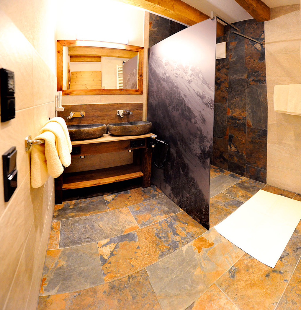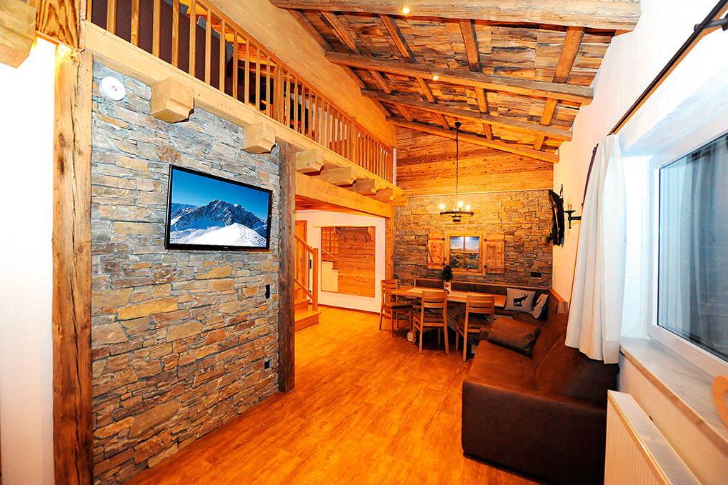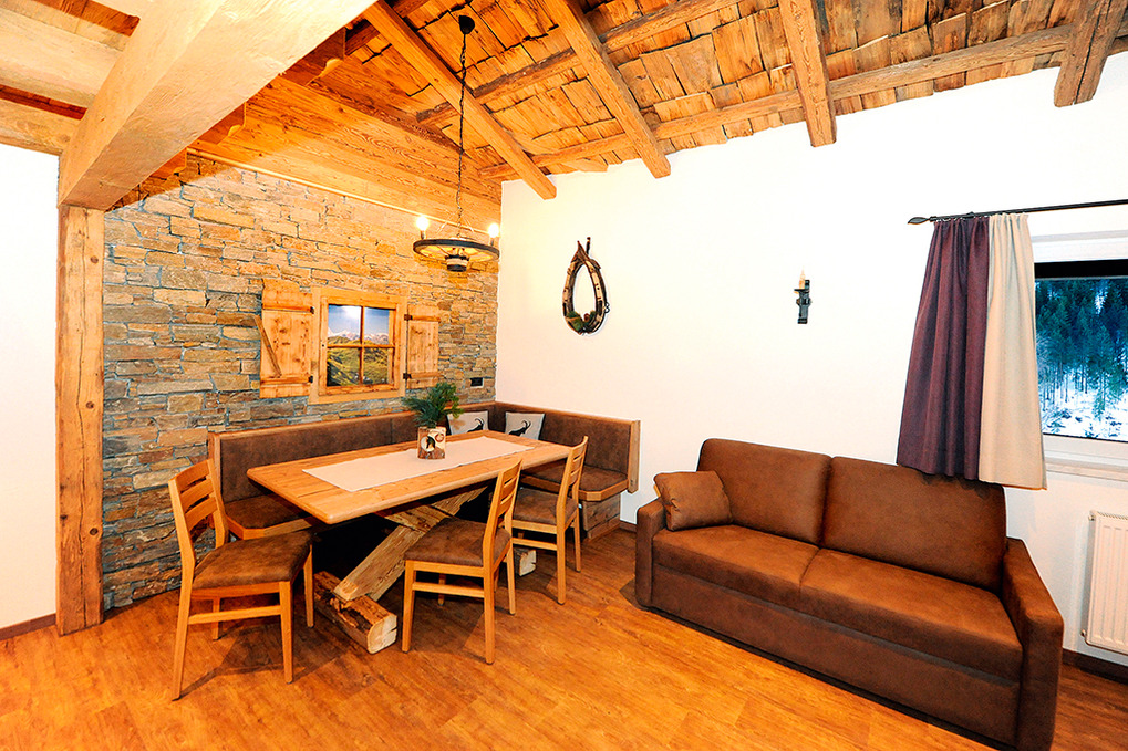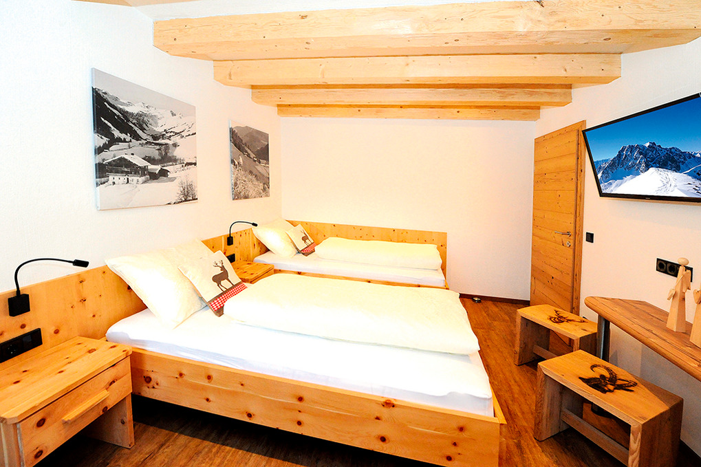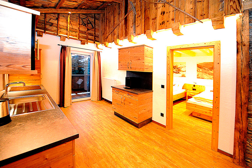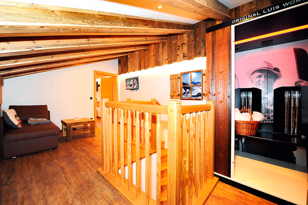 A 371.15 Wohnung 1-4 Pers.: 3-Zimmerwohnung mit 80 qm Wohnfläche über 2 Etagen. 2. Etage: Großzügiger zirbenholzvertäfelter Wohn/-Essraum mit Couch, Sat-TV, Esstisch, moderner Küchenzeile (Backofen, Mikrowelle, Spülmaschine, Kaffeevollautomat), Balkon. 2-Bettzimmer mit Balkon. Bad mit Du, 2 Wb. Separates WC. Vom Flur Holztreppe ins Dachgeschoss (Schrägen): Sitzecke auf Galerie mit Sat-TV, Infrarot-Wärmekabine. Doppelzimmer mit Balkon