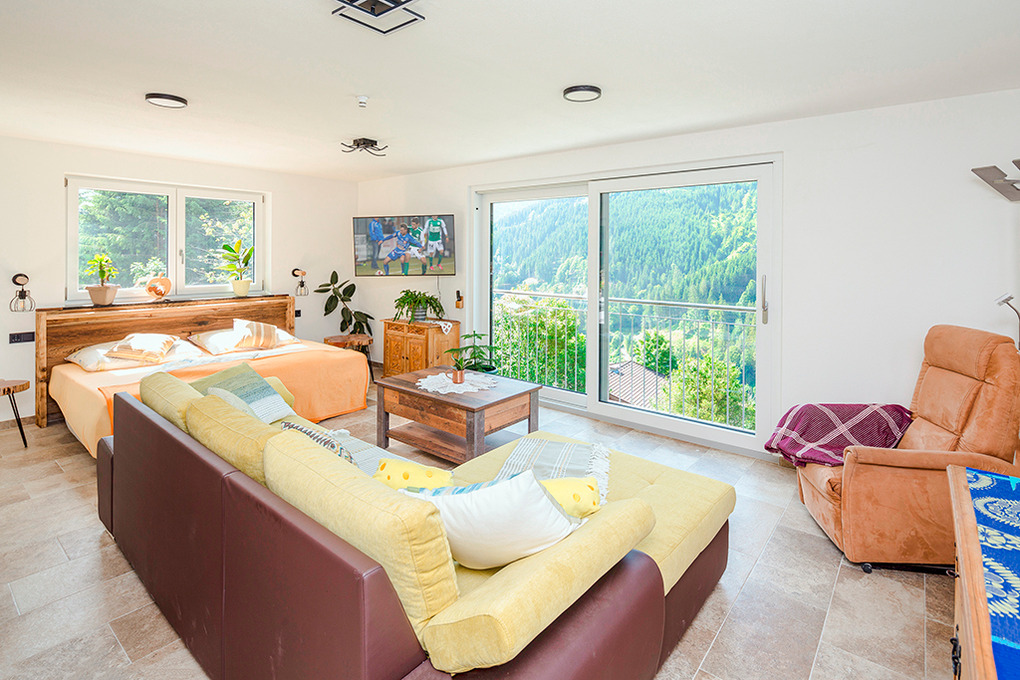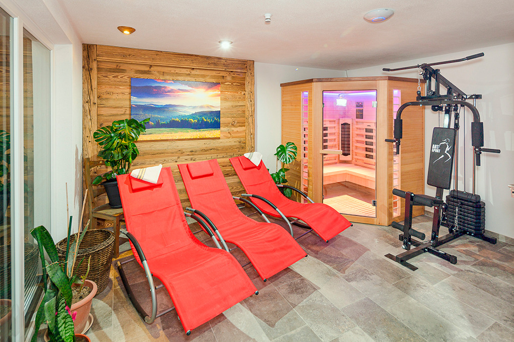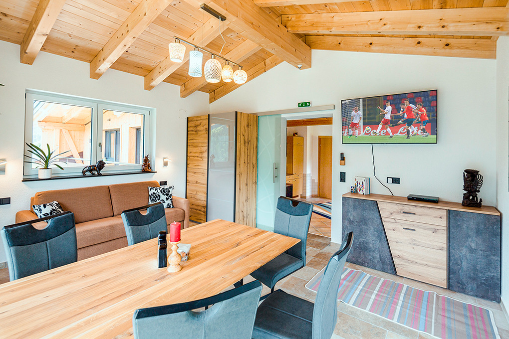 Haus: Modernes, komfortables Ferienhaus, in 2023 aufwendig renoviert mit Wellnessbereich (Infrarotkabine, Fitnessgeräte, Ruheliegen, Dusche), Außensauna (nutzbar von 17 bis 20 Uhr). Vier geschmackvoll eingerichtete Ferienwohnungen, die nur gemeinsam vermietet werden. Jede Fewo mit gut ausgestatteter Wohnküche mit Esstisch, moderner Küchenzeile (Backofen, Mikrowelle, Spülmaschine), Smart-TV. Es ergibt sich ein 11-Zimmerhaus mit 300 qm Wohnfläche über 3 Etagen. Bei einer Belegung mit 18 Personen nur Doppelzimmer. Gemeinsames Essen in der Wohnküche der großen Ferienwohnung in der 2. Etage. Jedes Schlafzimmer mit eigenem Smart-TV, DVD-Player. Kostenloser Internetzugang (W-Lan). Fußbodenheizung. Nachhaltige Bauweise und Energieversorgung durch Photovoltaikanlage und Bio-Holzheizung. Gemütlicher Aufenthaltsraum mit Bar, Smart-TV, Tischtennisplatte, Kicker, Dartscheibe im Keller. Waschmaschine/Trockner im Haus. Beheizter Ski-/Schuhraum. Vermieter wohnt im Haus. Nichtraucherhaus. Jede Fewo mit eigenem Balkon bzw. Terrasse mit Sitzmöbeln. 5 Pkw-Stellplätze unter dem Carport. 10 Pkw-Stellplätze am Haus. Hinweis: Der Vermieter gestattet eine maximale Belegung mit 22 Personen.