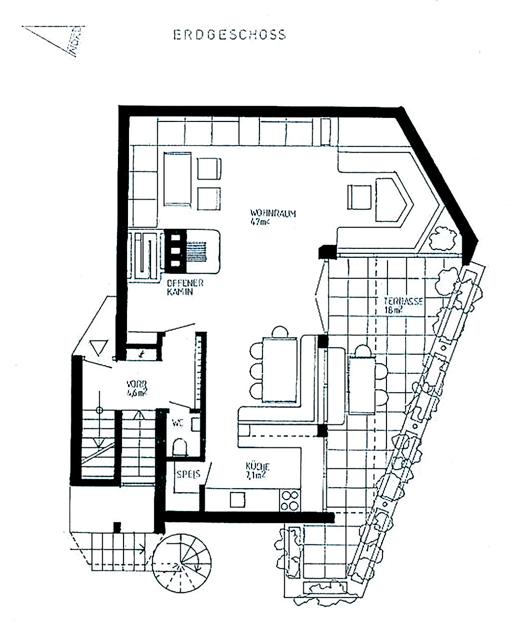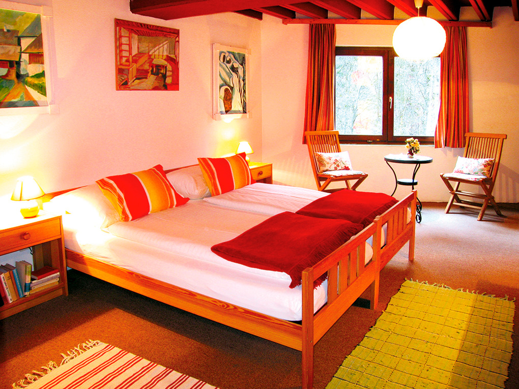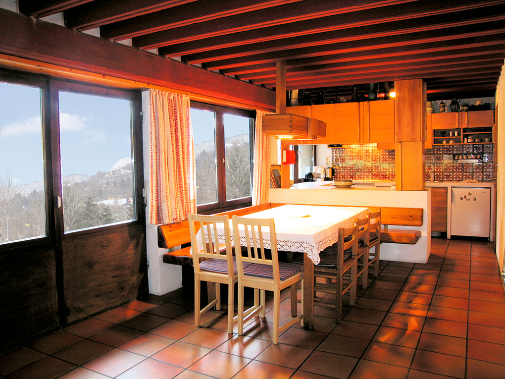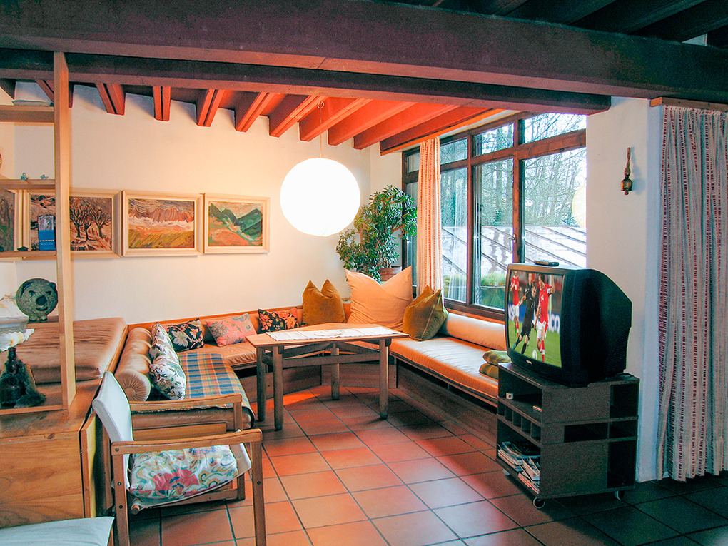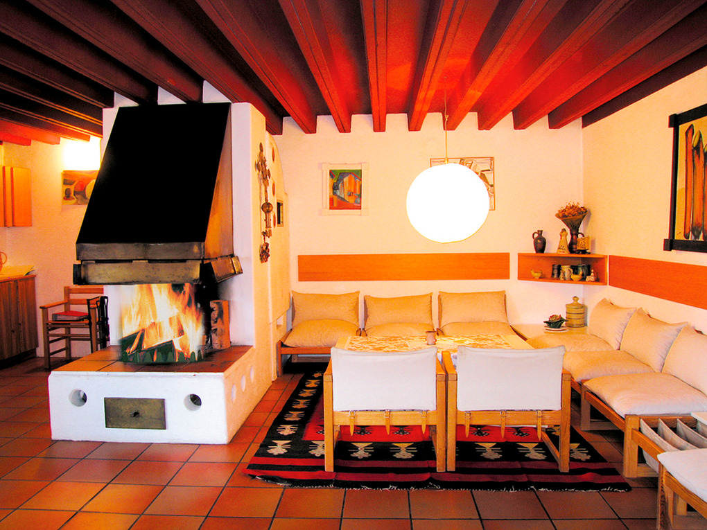Parterre: Großzügiger Wohn-/Essraum (55 qm) mit schöner Holzbalkendecke, gemütlicher Sitzecke am großen, offenen Kamin, weiterer Sitzecke, TV, Radio-CD, Esstisch, gut ausgestatteter Küchenzeile (Backofen, Spülmaschine). Separates WC. Terrasse mit Sitzmöbeln, schönem Bergblick.