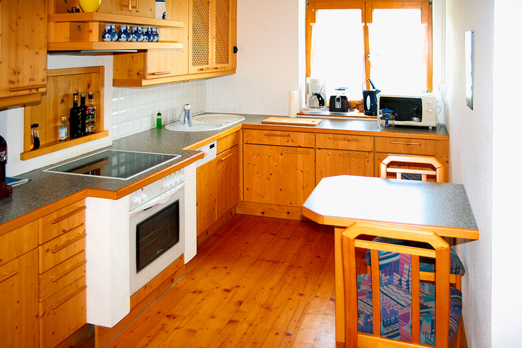 1. Etage: Gemütliches Wohnzimmer mit Kachelofen, Sofa-Sitzgruppe, Sat-TV, Stereoanlage, Balkon. Großes Esszimmer mit Esstisch (20 Pers.). Moderne Küche mit Küchenzeile (4 Pl. E-Herd, Backofen, Tiefkühltruhe, Spülmaschine). 2 separate WC.