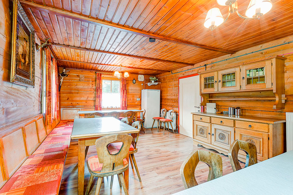 Parterre: Gemütliche Stube (ca. 25 qm) mit Kaminofen, Esstischen, Eckbänken. Zusätzlicher Aufenthaltsraum mit Couchgarnitur, Sat-TV. Separate Küche mit moderner Küchenzeile (zwei 4 Pl. E-Herde, 2 Backöfen, Mikrowelle, Spülmaschine), Esstisch, Eckbank, Durchreiche zur Stube. Abstellraum mit Skischuhtrockner. Separates WC.