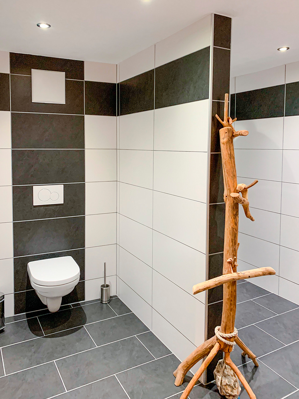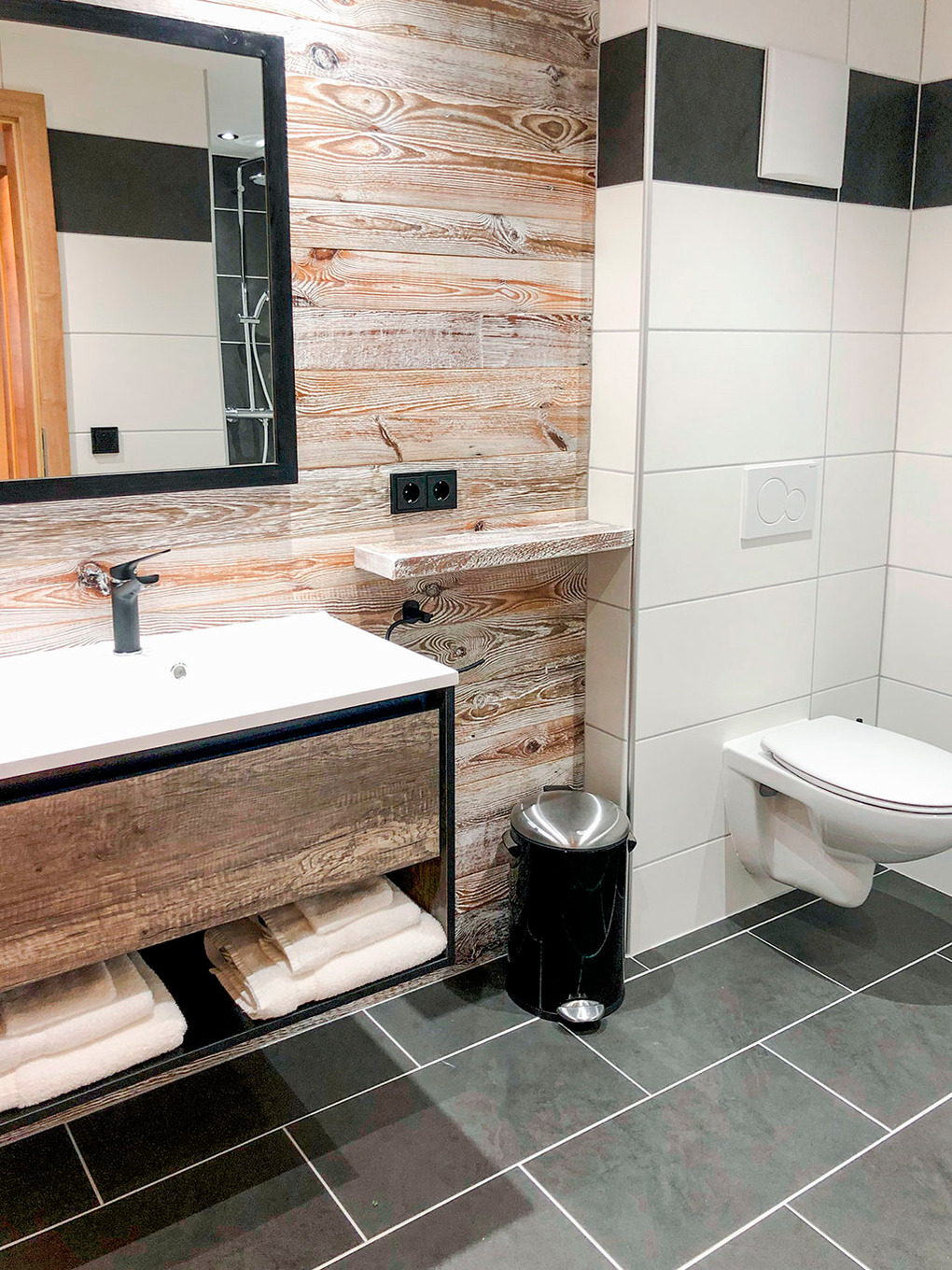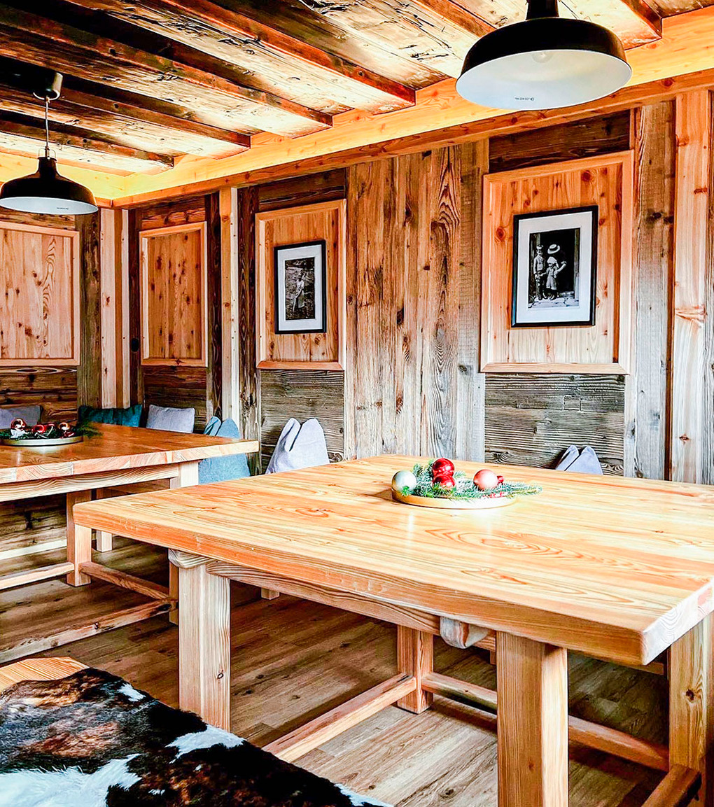 Parterre: Großzügiger Eingangsbereich mit Garderobe. Gemütliche Bauernstube mit Esstischen, Eckbänken, Sat-TV. Geräumige Wohnküche (25 qm) mit großem Esstisch, Eckbank, Küchenzeile (Backofen, Spülmaschine, zusätzlichem Holzherd). WC. Heizraum mit Skischuhtrockner.