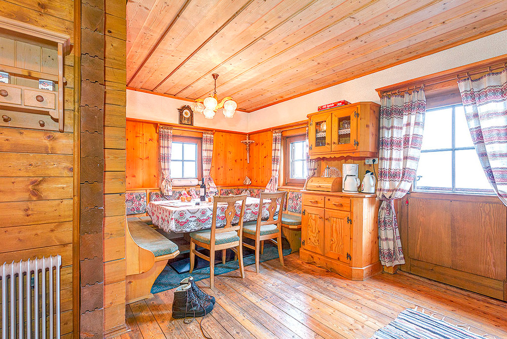 Haus: Schöne, liebevoll renovierte Almhütte. 4-Zimmerhaus mit 80 qm Wohnfläche über 2 Etagen. Rustikal-gepflegte Einrichtung. Gemütliches Ambiente durch Holzvertäfelung in allen Räumen. Heizung mit Holzherd (Wohnküche), E-Radiatoren (Zimmer). Skischuhtrockner im Haus. Terrasse mit Sitzecke. Balkon.