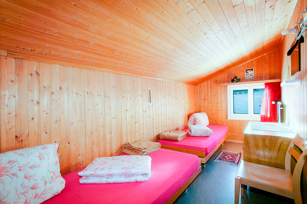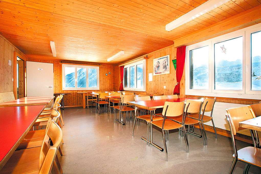 1. Etage: Freundlicher, holzvertäfelter Tagesraum mit herrlicher Aussicht, Beamer, Bluetooth-Lautsprechern. Zwei Schlafräume für 4/10 Pers., Holzetagenlager. Waschraum: 3 Duschen, 2 Waschrinnen (8 Hähne). 1 Pissoir. 2 separate WC.