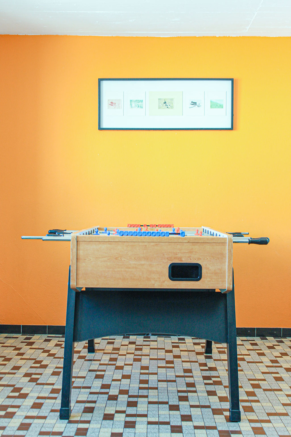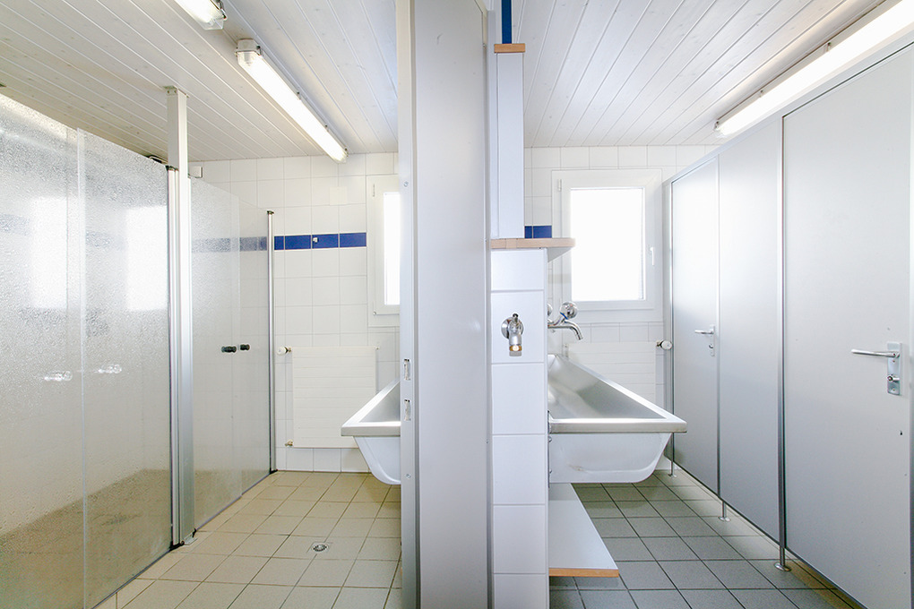 2. Etage: Ausgebautes Dachgeschoss mit Schrägen. 2-Bettzimmer. Drei Schlafräume für jeweils 8 Pers., Holzetagenlager, wenig Stauraum. Waschrinne (6 Hähne) in Flurnische. 1 Pissoir. 2 separate WC.